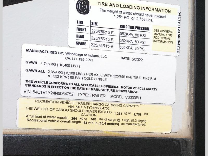 Used 2022 Winnebago Industries Towables Voyage 3033BH Travel Trailer