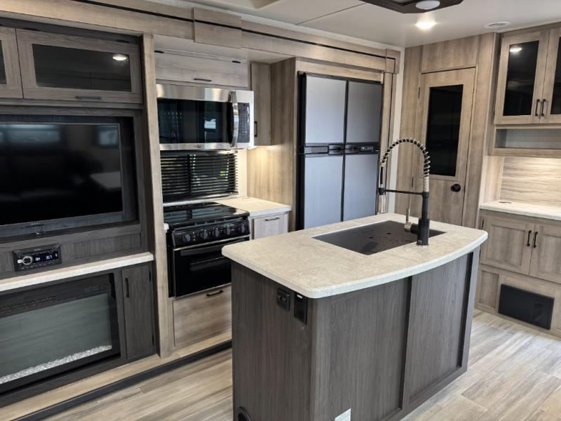 This Voyage travel trailer has lots of space and amenities! There are a total of three slides, and they provide lots of extra floor space for you and your gang to spread out and relax. The rear private bunkhouse has two bunks, a tri-fold sofa, and a wardrobe, so this area is perfect for any overnight guests. In the main living area and kitchen, there is a center island, kitchen appliances including a convection microwave, a pantry and two hutches, plus theater seating and a booth dinette or choose the free-standing table with chairs, and an entertainment center with LED TV. And the cook has an exterior kitchen to utilize when wanting to be outside with everyone. There is a full bathroom to get cleaned up in, and a front private bedroom with a queen-size bed and nightstands or choose a king option, three wardrobes and there is a washer/dryer prep space.
