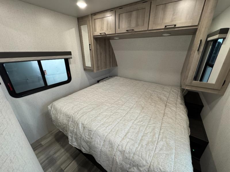Each Voyage travel trailer by Winnebago Industries Towables includes two 100-watt solar panels with a charge control monitor so you can camp off-grid, satellite and antenna connections, and an antenna with wifi prep. Also included is a heated and enclosed underbelly with thermo foil insulation for four seasons of travel, a gel coat fiberglass front cap with integrated LED lighting, walk-on roof decking, plus four-point power/electric stabilizers for easy setup and stability. The interior offers comforts of home, large windows, ceiling LED lights, ductless flooring throughout, and full kitchen amenities. No voyage is better than the one taken in the Voyage travel trailer!