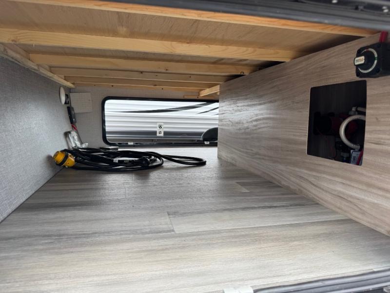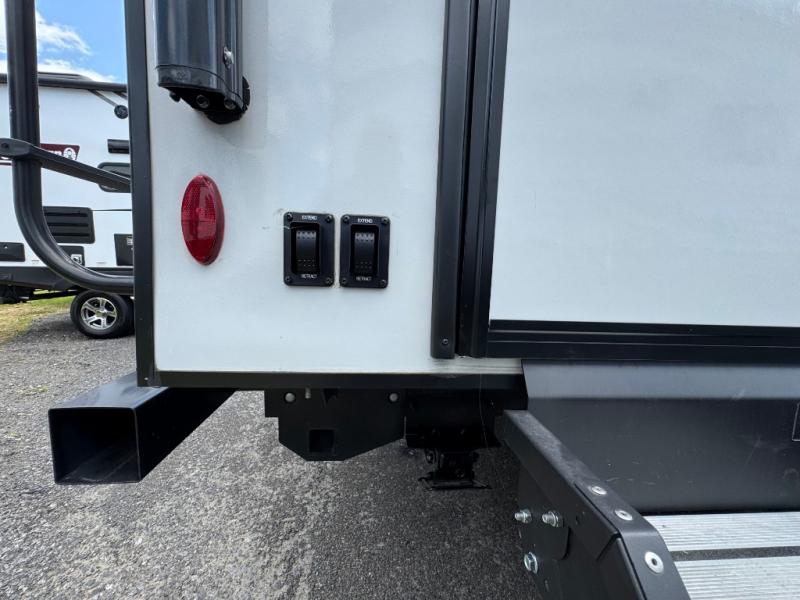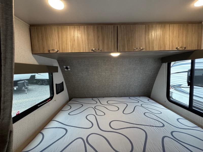 Don't pass your chance to camp comfortably with your spouse in this travel trailer! Up front there is a 60" x 74" RV queen bed with a divider curtain for privacy at night. Scramble up some eggs with the three burner cooktop and grab a cup of orange juice from the 10.3 cu. ft. refrigerator then head to the 44" x 72" booth dinette slide to enjoy your meal. The dinette can also transforms into an extra sleeping space if you want a tag along guest. Everyone can freshen up in the rear corner bathroom and watch their favorite movies on the LED TV!