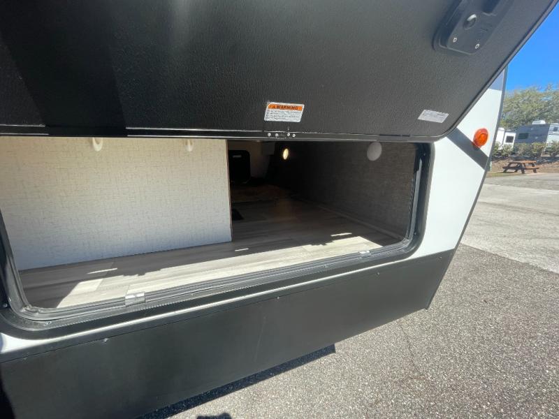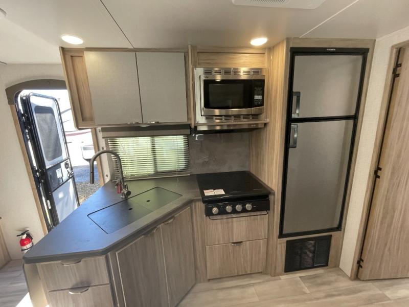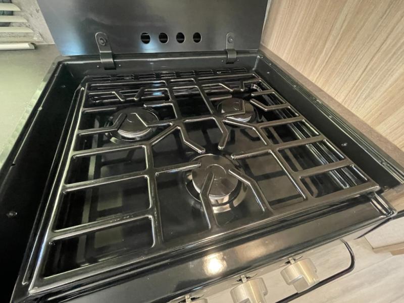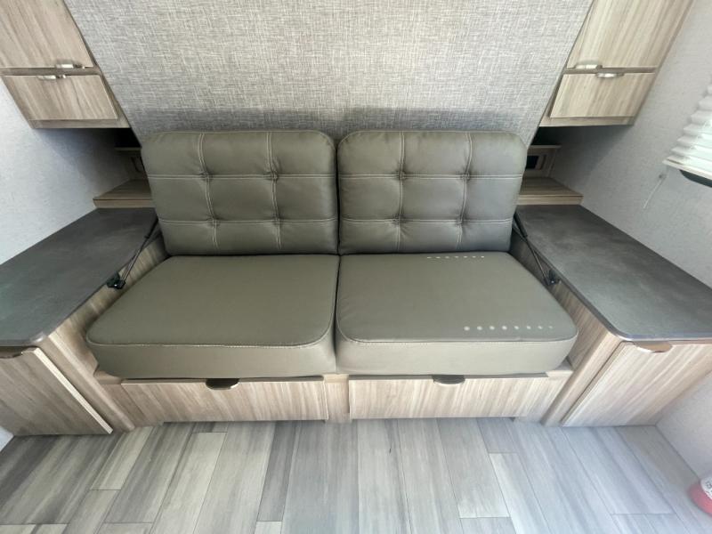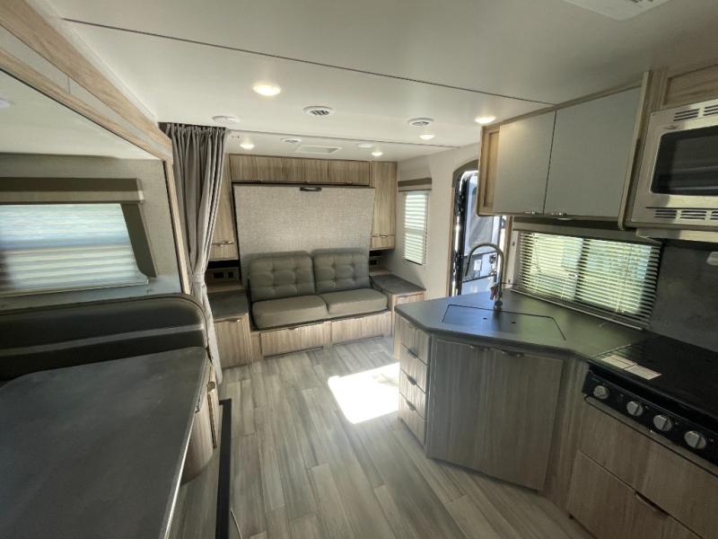 Versatility comes standard in this spacious travel trailer that can sleep four people each night. The Murphy bed will provide a great night's rest each night, and it can fold away in the morning to relax on the 72" sofa. There are dual wardrobes on either side of the bed for your clothes, and the spacious full rear bath is an added comfort you won't want to camp without. Your guests can sleep on the U-shaped dinette slide out when it's not being used to dine at, and there is an LED TV in the living area to enjoy movie night. This model also includes a three burner cooktop, a convection microwave, and a 10.3 cu. ft. 12V refrigerator for perishables.