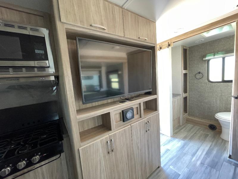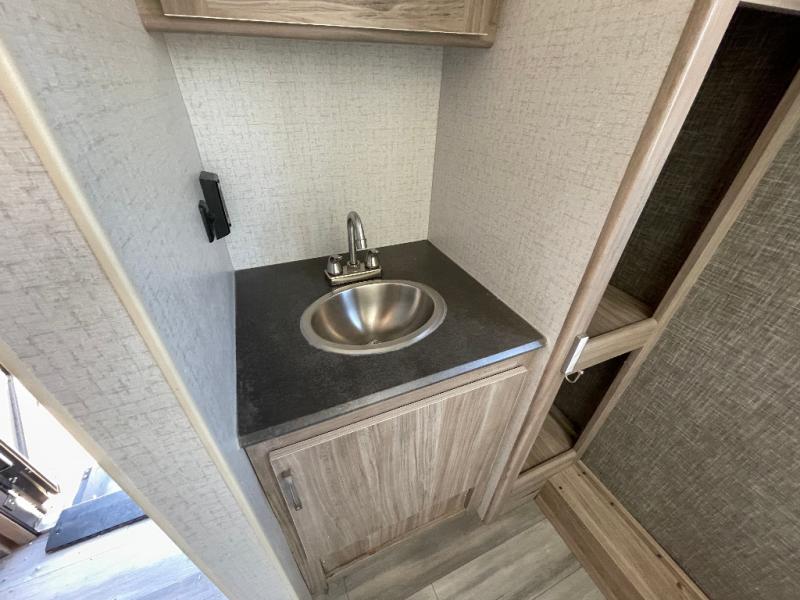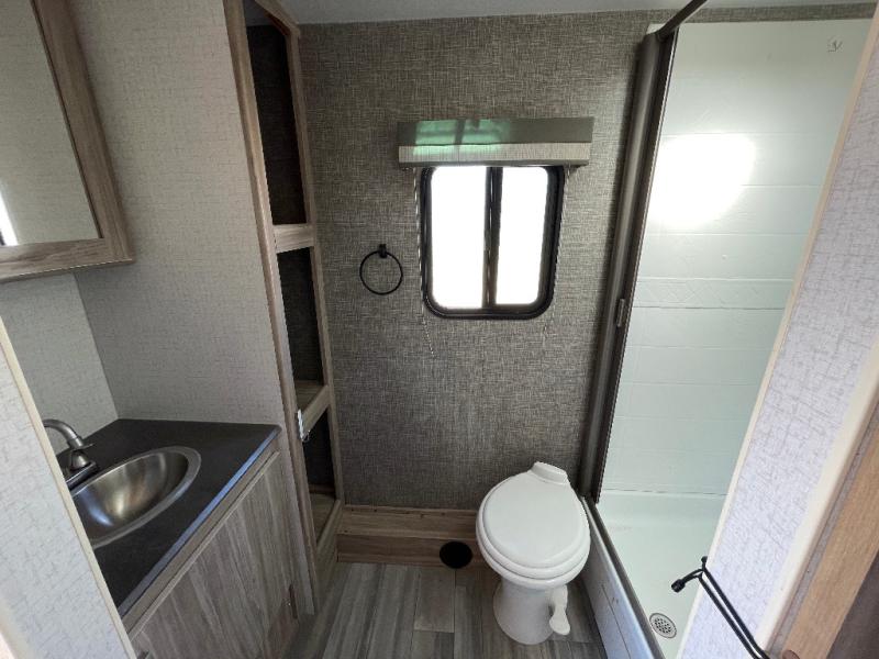 Adventure comfortably in this Minnie travel trailer for two or four featuring a rear full bath for added convenience. All guests will appreciate a 30" x 36" shower, linen cabinet and toilet all behind a space saving sliding door. Multiple seating and sleeping configurations are available with the front twin beds that can easily convert to a 74" x 94" king bed. Another sliding door to the front bedroom again saves space and provides privacy from the rest of the unit. You can even turn the sofa into added sleeping space when needed. This unit also features plenty of options in seating with your choice of theater seating, a u-shaped dinette, or sofa w/chaise in place of the tri-fold sofa with table if you like. Enjoy JBL premium sound interior speakers for listening to your tunes, and USB charging ports to keep all of your devices fully charged and ready to use.