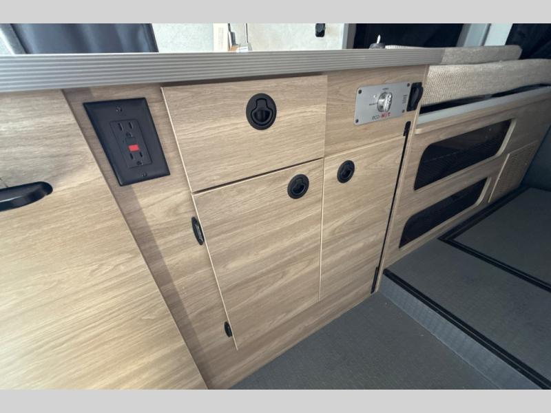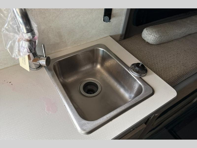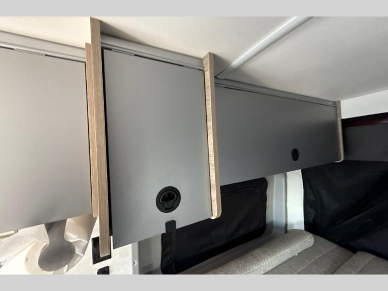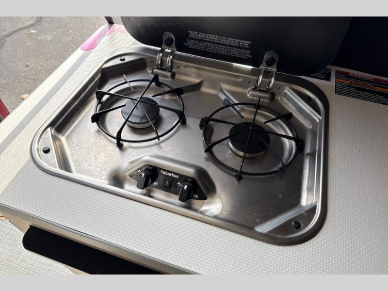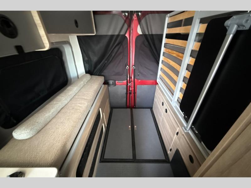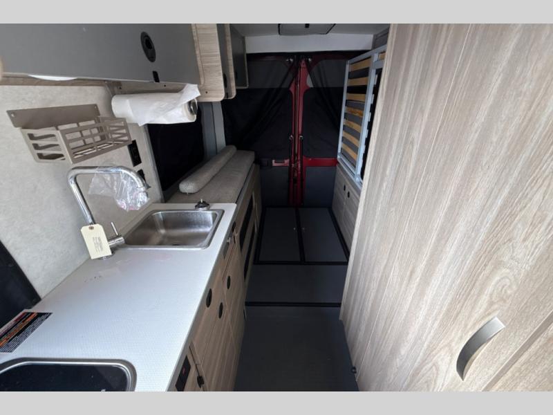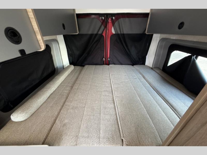 Enjoy a weekend ride in the mountains or make it an overnight stay with versatile sleeping options in this camper van. You'll find the Murphy+ bed in the back will provide a great night's rest, or you can choose the optional sofa/bed with added belted seating if you have more tag-alongs. And of course the little ones will love the pop-top sleeping area to climb into each night. After you've freshened up in the convenient wet bath, prepare breakfast on the two burner range, and the milk and eggs can go back in the 3.0 cu. ft. single door refrigerator/freezer. This model also includes rear double doors with screens to let the breeze in and keep bugs out!