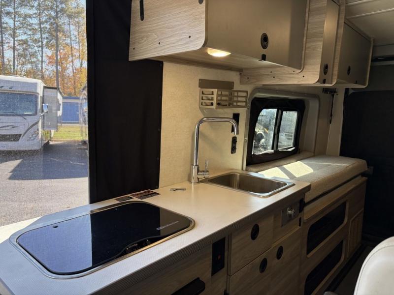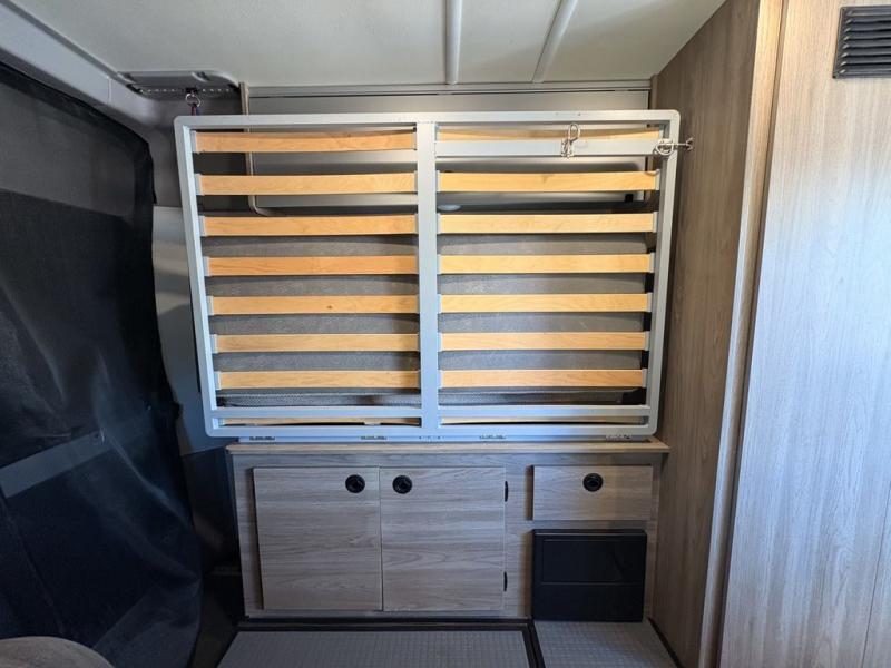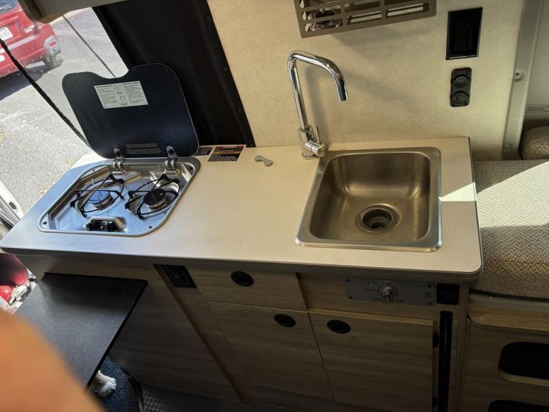 This camper van with an L-track storage system is perfect for those needing more storage space for their hiking and biking gear. You can stay powered up with the Cummins Onan QG 2800i gas generator, and there is a Coleman Mach 10NDQ A/C with directional vents that will allow you to come inside to cool off after a trail ride. A Murphy+ bed comes standard, or you can choose the optional sofa/bed, and any guests that tag along can sleep in the pop-top sleeping area! You'll find the wet bath to come in handy when you want to clean up, and the dinette seating with a removable pedestal table will provide a place to enjoy your dinner at.