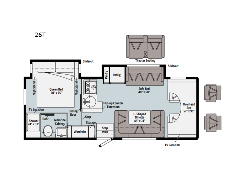 The ultimate family-friendly coach is found with this Spirit model 26T. The double slides provide more space to let everyone move about, and the private bedroom and bathroom are sure to come in handy when you need your own space. The little ones will love the cabover bunk, and you'll find additional sleeping space on the sofa bed and U-shaped dinette. Meals can be made on the three burner cooktop, and leftovers can go in the 8 cu. ft. large double door refrigerator/freezer. This model includes plenty of storage space, including a bedroom wardrobe, a kitchen pantry, plus trunk storage for camp gear.