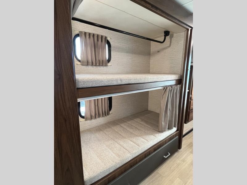 If you've been searching for a coach to sleep your crew of eight, look no further than this 31H Spirit model with bunk beds! The bunks include a convenient storage compartment and privacy curtains, plus they are right across from the full bath for nighttime use. You will love having the rear private bedroom all to yourselves with an RV queen bed, dual nightstands, plus a chest of drawers for added storage. And your other guests can sleep on the sofa bed, U-shaped dinette, and cabover bunk. The full kitchen includes everything you need to prepare meals each day, including a microwave oven, a three burner cooktop, plus an 8 cu. ft. large double door refrigerator/freezer.