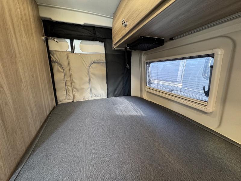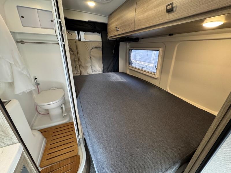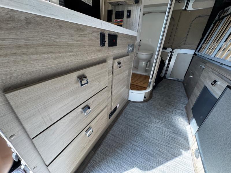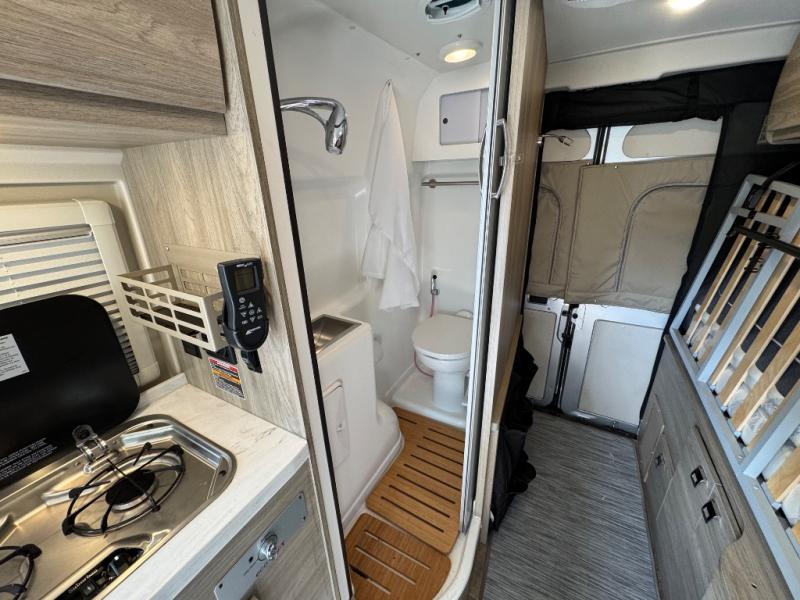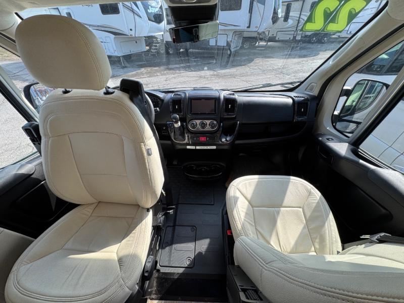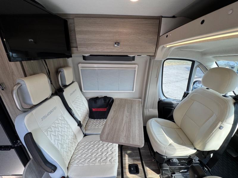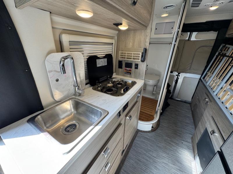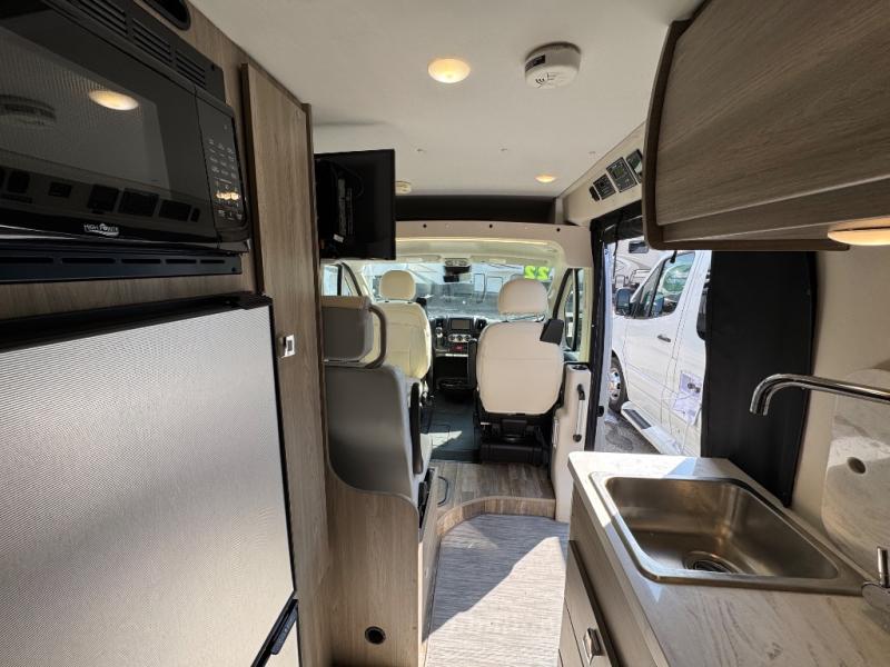 Efficiency meets comfort in the Travato Class B gas motorhome by Winnebago. The 215W solar panels and the energy management system allow you to go off-grid when the adventure calls for it, and the Coleman Mach 10 NDQ A/C will keep you comfortable during the hot summer months. If the weather is nice out, set up the power awning with LED lights or stay inside with the side and rear screen doors closed to keep the bugs out. Each model includes plenty of storage space, including RAM Tough-Track Mounts throughout, Anything Keeper drop-down storage baskets, plus below-floor storage for your outside gear. The Travato also includes a Corian countertop and a spice rack in the galley, a convenient medicine cabinet and mirror in the bath, plus LED ceiling lights throughout to keep everything bright and open! Some of the new additions to the Travato are the Bluetooth sound bar, Honeycomb composite insulated flooring, convenience door strap, and the monitor panels that have been relocated above the sliding door.