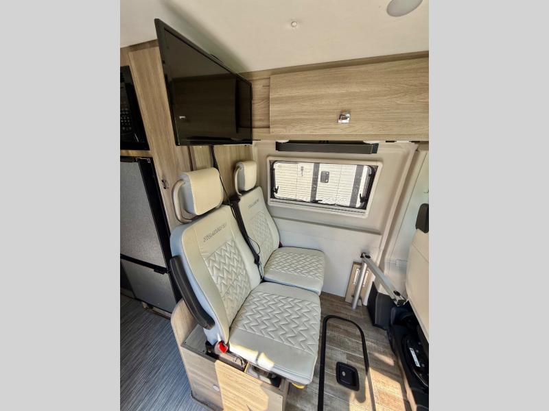 Set out on a new adventure in this Travato Class B gas motorhome. The swivel cab seats feature adjustable lumbar support and comfortable armrests so that you will enjoy the drive just as much as the destination. You can prepare meals each day on the two-burner cooktop, and the flip-up countertop extension will provide space to cut fresh veggies. There is also a pantry and a two-door refrigerator/freezer to store food for the week. The additional cab seats have an adjustable/removable table in front of them to give you a place to dine at each day, and there is a 49" x 77" bed in the back for you and your spouse!