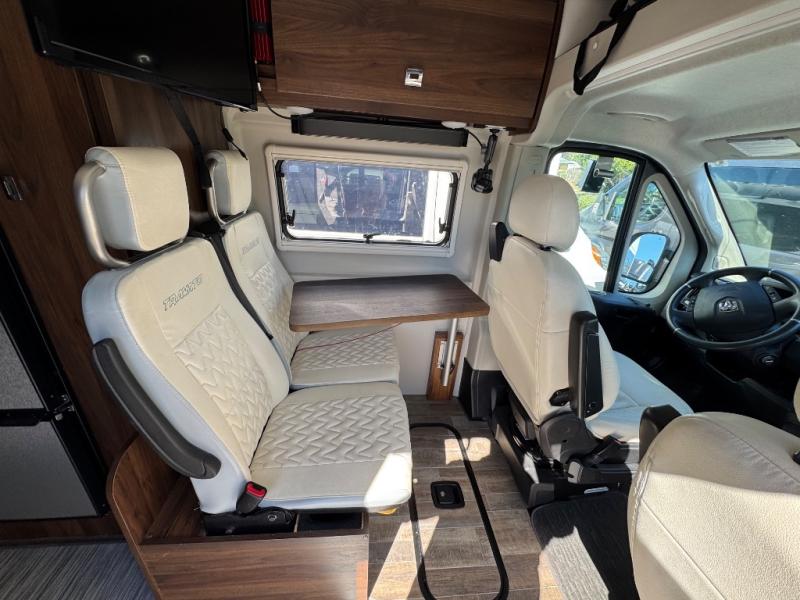 Efficiency meets comfort in the Travato Class B gas motorhome by Winnebago. The 215W solar panels and the energy management system allow you to go off-grid when the adventure calls for it, and the Coleman Mach 10 NDQ A/C will keep you comfortable during the hot summer months. If the weather is nice out, set up the power awning with LED lights or stay inside with the side and rear screen doors closed to keep the bugs out. Each model includes plenty of storage space, including RAM Tough-Track Mounts throughout, Anything Keeper drop-down storage baskets, plus below-floor storage for your outside gear. The Travato also includes a Corian countertop and a spice rack in the galley, a convenient medicine cabinet and mirror in the bath, plus LED ceiling lights throughout to keep everything bright and open! Some of the new additions to the Travato are the Bluetooth sound bar, Honeycomb composite insulated flooring, convenience door strap, and the monitor panels that have been relocated above the sliding door.