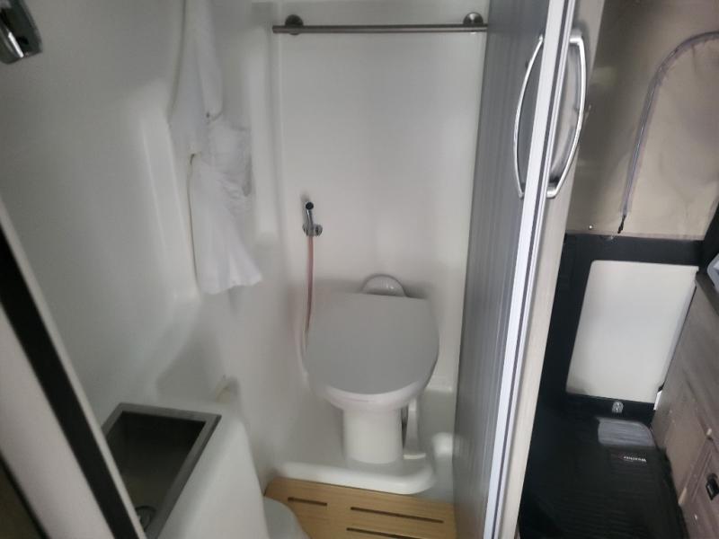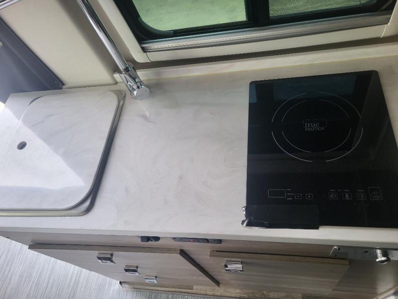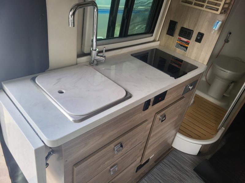 Set out on a new adventure in this Travato Class B gas motorhome. The lithium Pure Energy Management System provides 9,600 usable watt-hours of stored energy for extended power on your trip. You can prepare meals each day on the single-burner induction cooktop, and the flip-up countertop extension will provide space to cut fresh veggies. There is also a pantry and a two-door refrigerator/freezer to store food for the week. The extra cab seats give you a place to dine at each day with the adjustable/removable table in front of them, and there is a 49" x 77" bed in the back for you and your spouse!