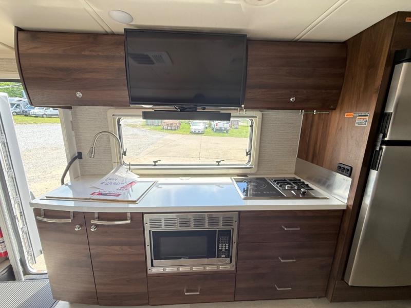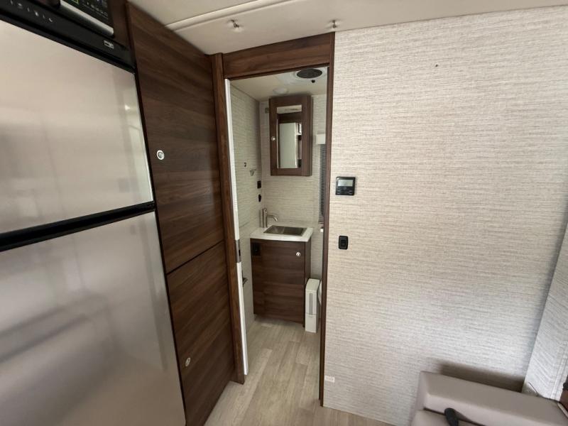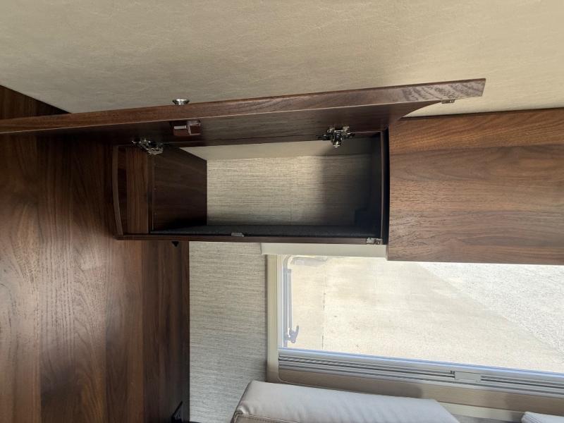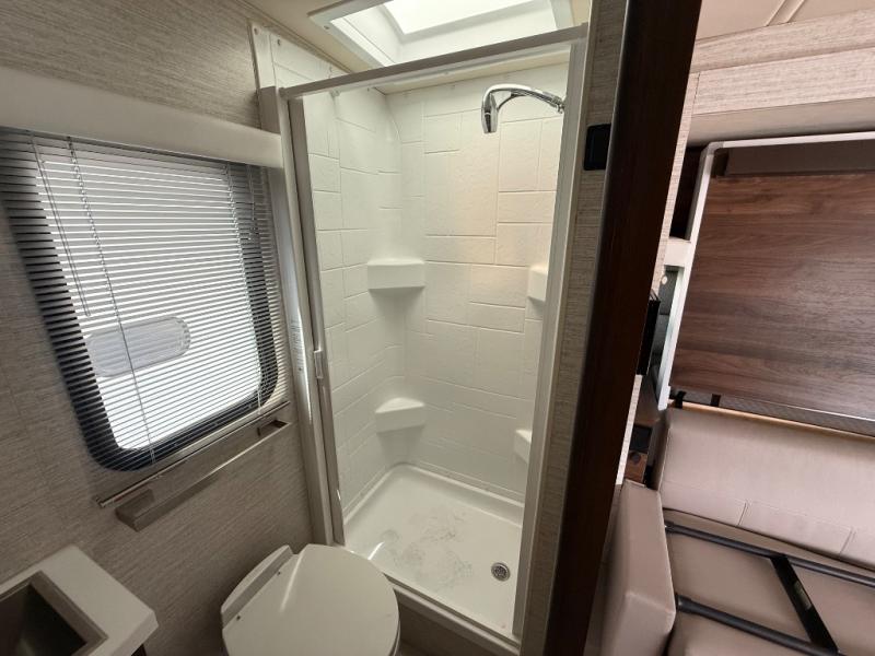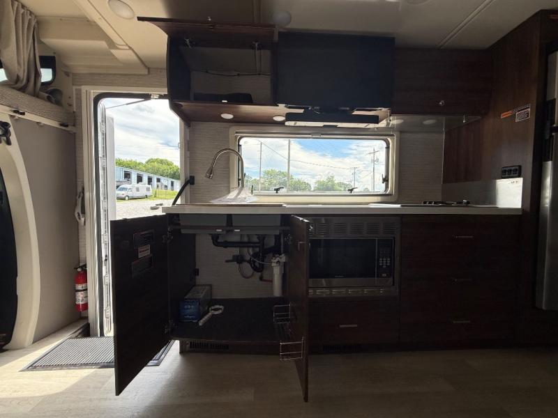 A couple or family will enjoy the look of the interior each time they take this View Class C diesel motorhome on the road. With the curved cabinets, the lighted soft-close galley drawers, and the sprung-cushion dinette and sofa seats, there will surely be a favorite feature for everyone. You will be able to easily set up the queen Murphy+ bed when it's time for bedtime while the kids sleep on the bunk above the cab or the U-shaped dinette. You might like to add the theater seating option with swivel tables if you don't need that extra sleeping space. Everyone can get cleaned up in the full rear bathroom that has a space-saving sliding door before making meals with full kitchen amenities including a convection microwave/oven.
