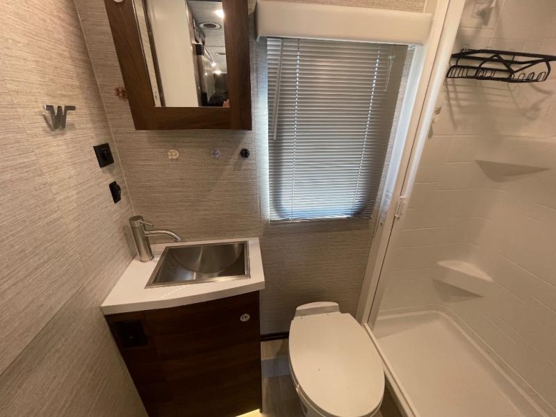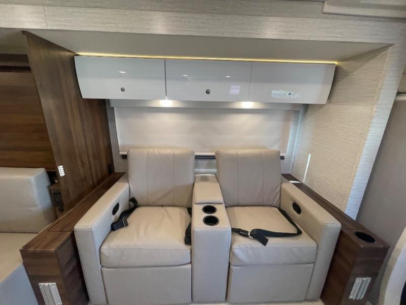 A couple or family will enjoy the look of the interior each time they take this View Class C diesel motorhome on the road. With the curved cabinets, the lighted soft-close galley drawers, and the sprung-cushion dinette and sofa seats, there will surely be a favorite feature for everyone. You will be able to easily set up the queen Murphy+ bed when it's time for bedtime while the kids sleep on the bunk above the cab or the U-shaped dinette. You might like to add the theater seating option with swivel tables if you don't need that extra sleeping space. Everyone can get cleaned up in the full rear bathroom that has a space-saving sliding door before making meals with full kitchen amenities including a convection microwave/oven.