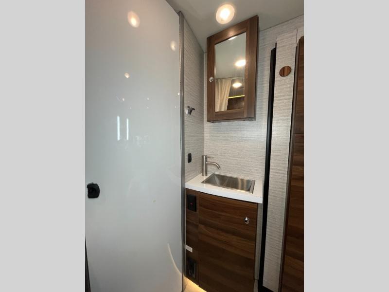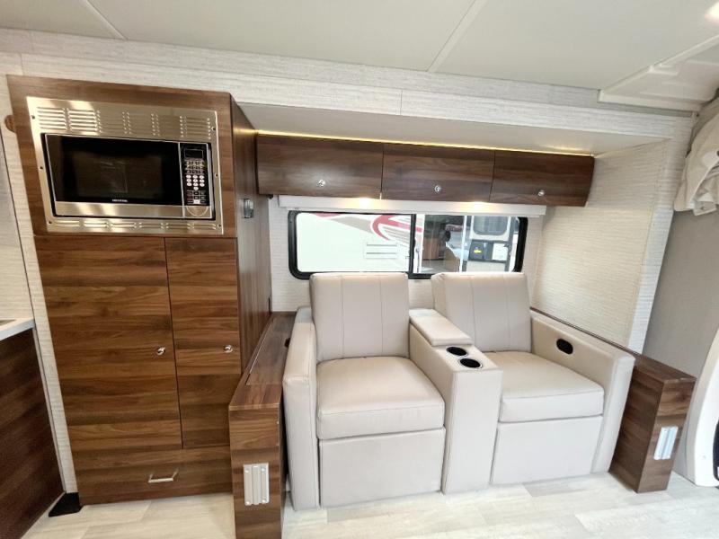 Your family will enjoy seeing the views riding down the road in this View Class C diesel motorhome. The kids can play games at the U-shaped dinette that has three seatbelts, and once at your destination, the dinette footrests may come in handy. The driver and passenger will enjoy the heated, power cab seats that can swivel for more seating. Everyone will enjoy the look and convenience of the curved cabinets, the lighted soft-close galley drawers, and the sprung-cushion dinette seats. The cross-coach storage holds larger items, and the above-bed Anything Keeper storage stows things away such as your cellphone. You might like to add the theater seating option with swivel tables in place of the U-shaped dinette if you don't need that extra sleeping space. The cook will appreciate the kitchen appliances to make meals, and the bathroom has the bath sink just outside the door.