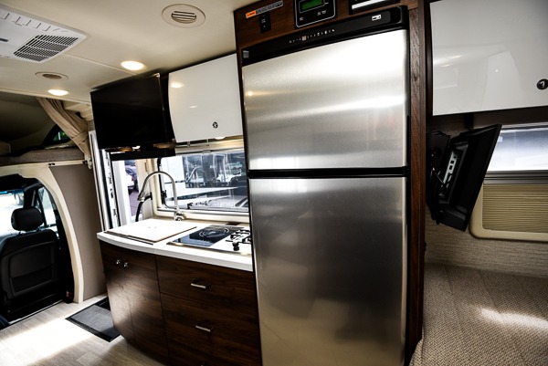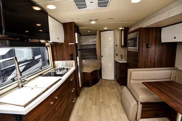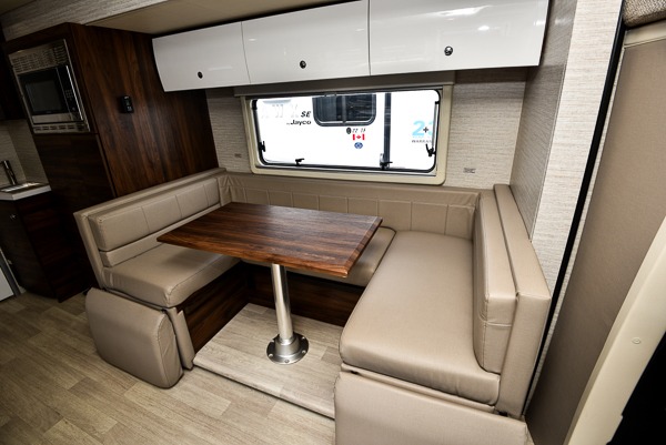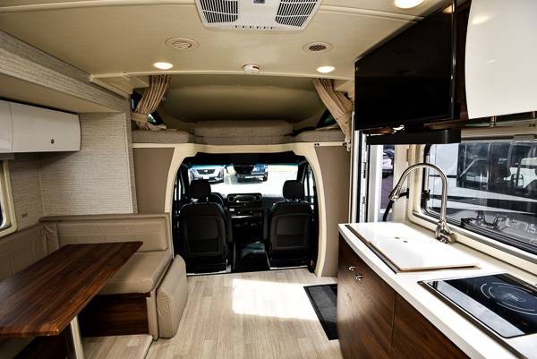 Your family will enjoy seeing the views riding down the road in this View Class C diesel motorhome. The kids can play games at the U-shaped dinette that has three seatbelts, and once at your destination, the dinette footrests may come in handy. The driver and passenger will enjoy the heated, power cab seats that can swivel for more seating. Everyone will enjoy the look and convenience of the curved cabinets, the lighted soft-close galley drawers, and the sprung-cushion dinette seats. The cross-coach storage holds larger items, and the above-bed Anything Keeper storage stows things away such as your cellphone. You might like to add the theater seating option with swivel tables in place of the U-shaped dinette if you don't need that extra sleeping space. The cook will appreciate the kitchen appliances to make meals, and the bathroom has the bath sink just outside the door.