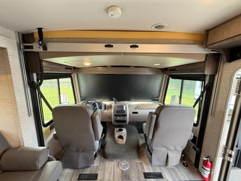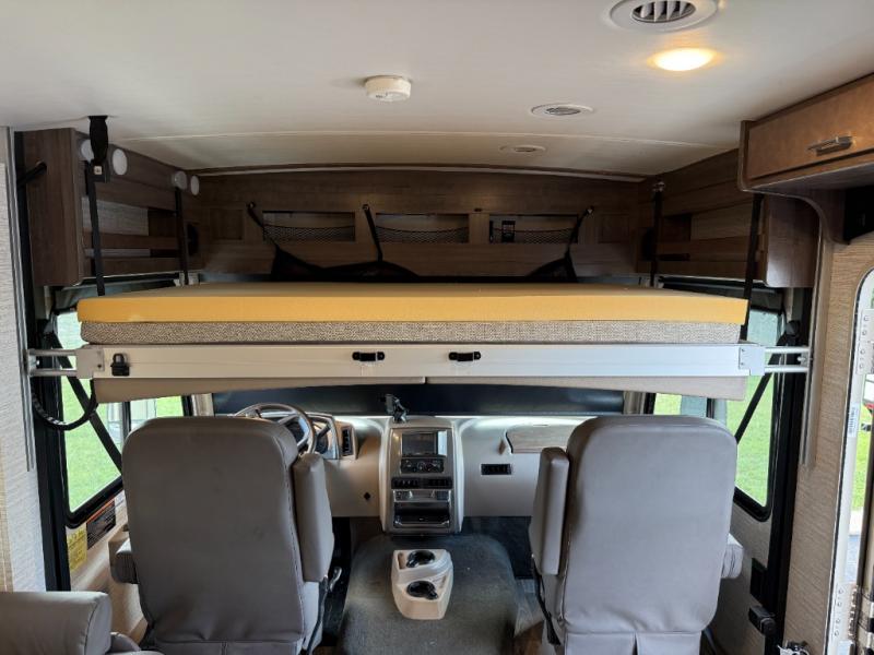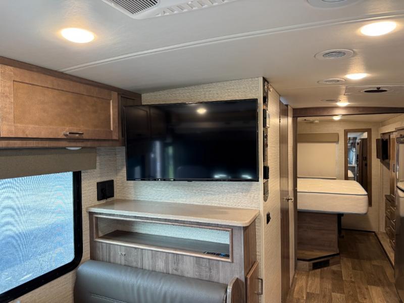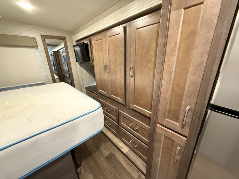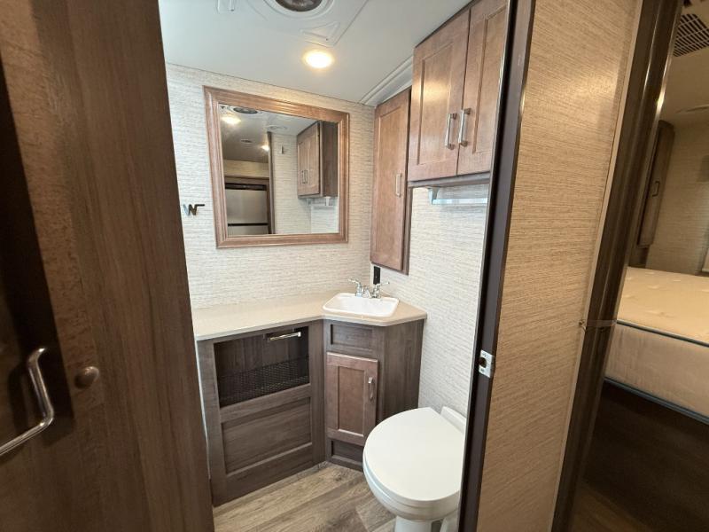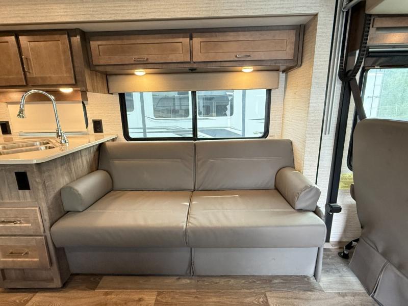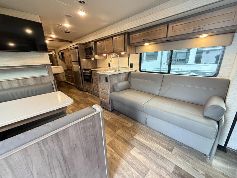 This motorhome will be your home away from home! It features a rear private bedroom with a 60" x 75" queen bed across from a wardrobe and a storage area that is also prepped to add an optional TV. Start and end your days feeling squeaky clean after showering in the 26" x 38" shower, and keep your bellies full with the three burner recessed range and 10 cu. ft. refrigerator, plus there are two pantries to store everyone's favorite snacks. The 42" x 66" dinette with hi-lo table comes with storage to keep your games close, and the 40" x 66" sofa bed can be switched out for the optional theater seating to relax in true comfort while you watch your favorite movies. You can also add an optional StudioLoft powered 48" x 80" bed above the swivel cab seats!