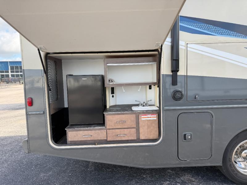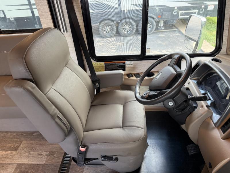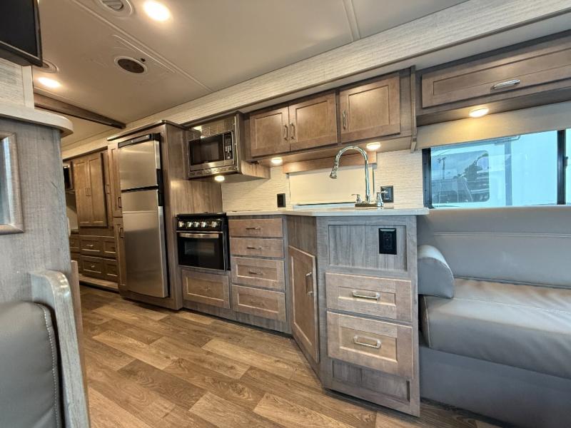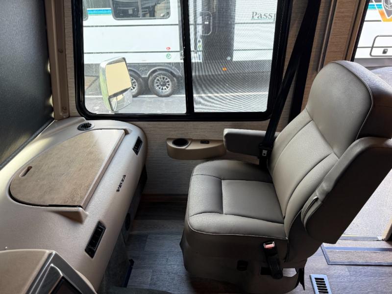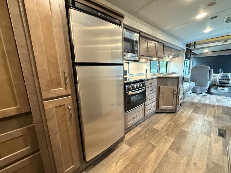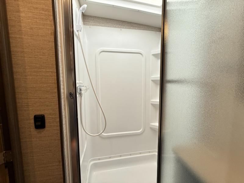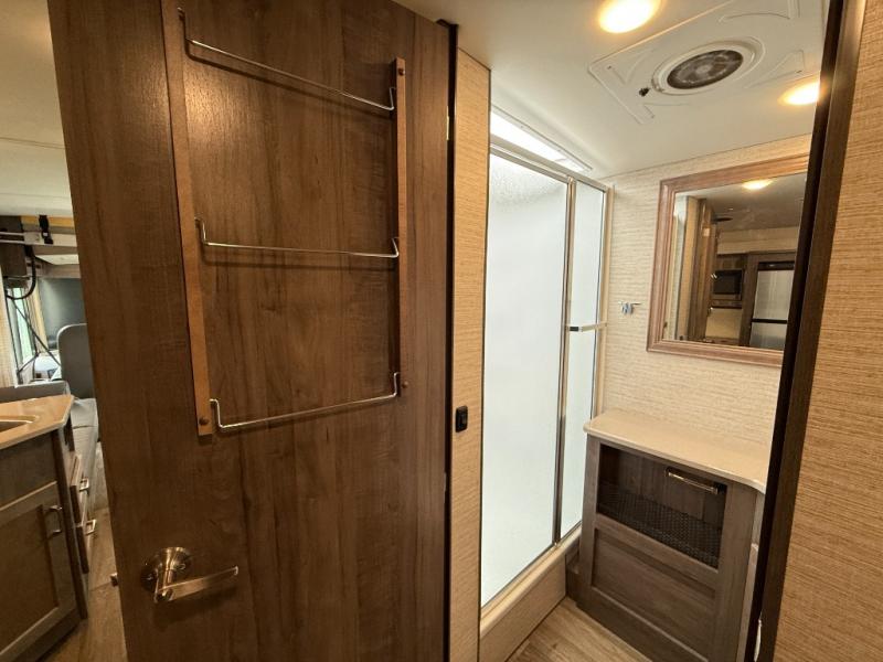 This motorhome will be your home away from home! It features a rear private bedroom with a 60" x 75" queen bed across from a wardrobe and a storage area that is also prepped to add an optional TV. Start and end your days feeling squeaky clean after showering in the 26" x 38" shower, and keep your bellies full with the three burner recessed range and 10 cu. ft. refrigerator, plus there are two pantries to store everyone's favorite snacks. The 42" x 66" dinette with hi-lo table comes with storage to keep your games close, and the 40" x 66" sofa bed can be switched out for the optional theater seating to relax in true comfort while you watch your favorite movies. You can also add an optional StudioLoft powered 48" x 80" bed above the swivel cab seats!