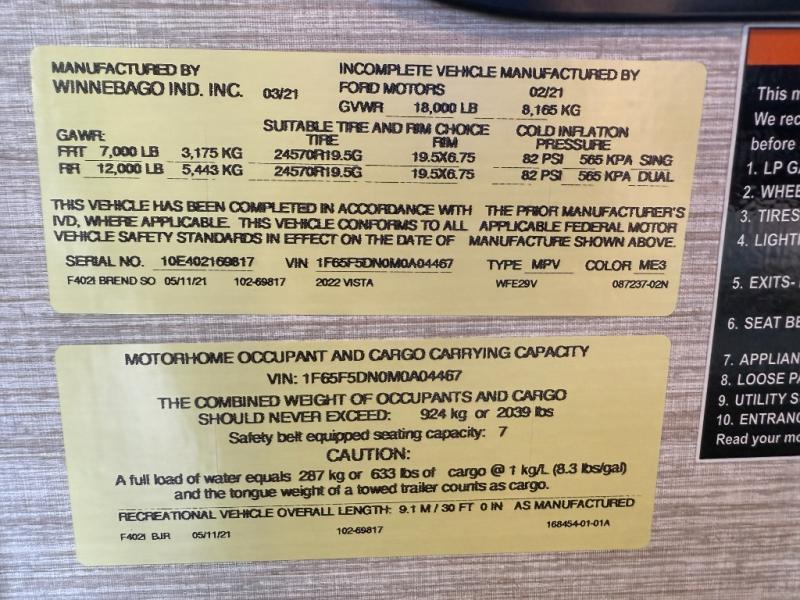 Every one of these Winnebago Vista Class A gas motorhomes expand horizons while bringing families together! They are powered by a 7.3L PFI V8 engine with a Ford F53 chassis, and also have a hill-start assist and electronic stability control, plus enough towing capacity to bring along one of your favorite toys. The adjustable swivel cab seats can slide and recline so you can be sure to have the perfect level of comfort in addition to entertainment with a Sony 7" touch panel color monitor that is Sirius XM ready and Bluetooth compatible with Android Auto and Apple CarPlay. The powered MCD blackout roller visor/shade on the front windshield provides extra privacy, and the passenger dash workstation lets you get some work done while on the road. Come find your favorite model today!