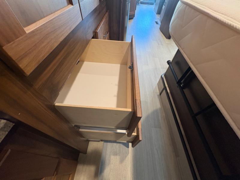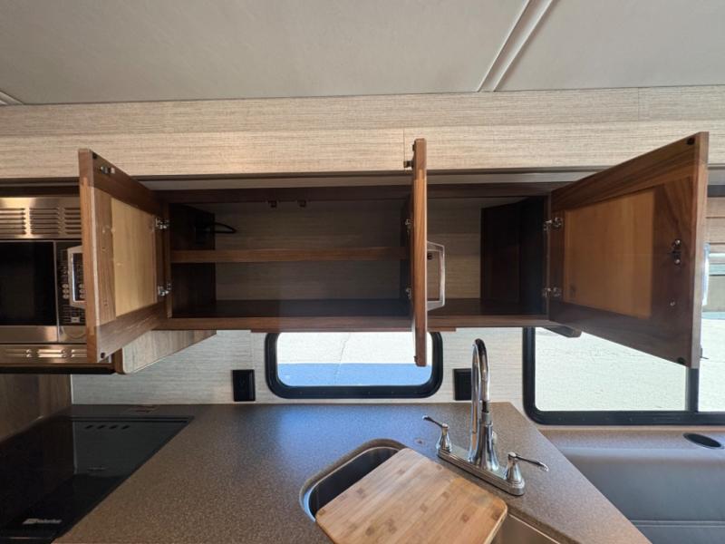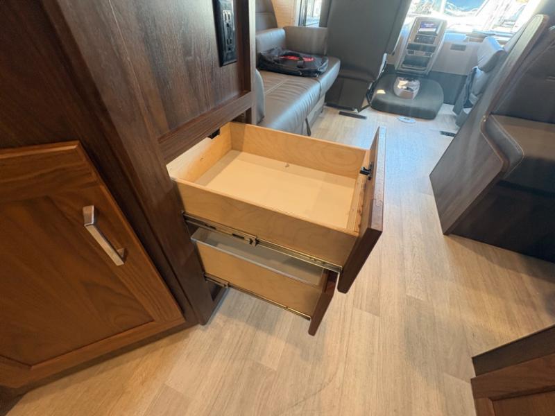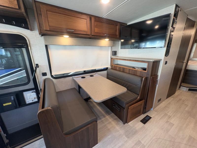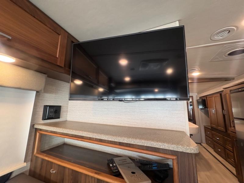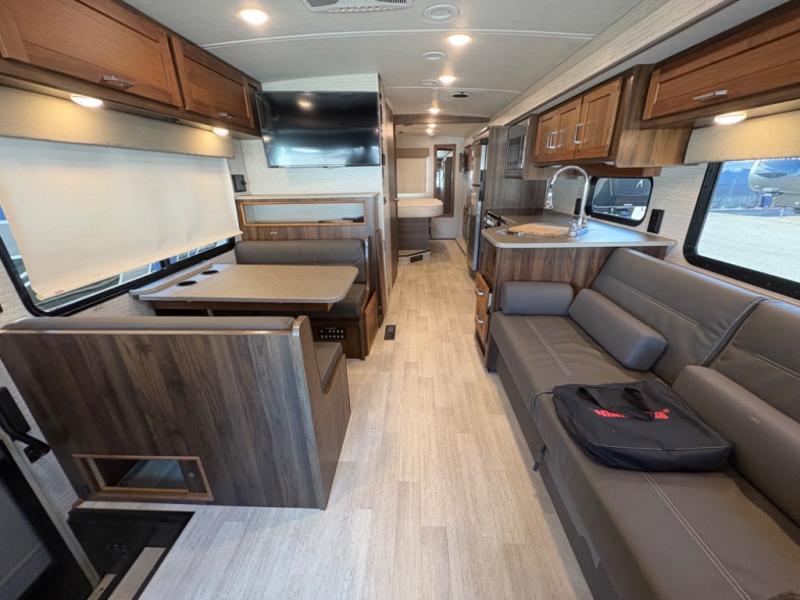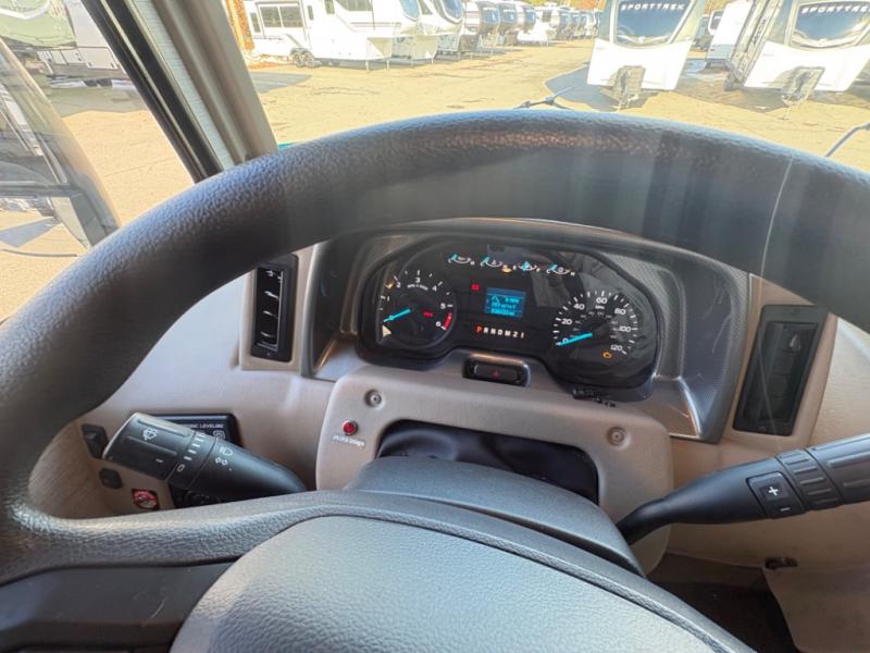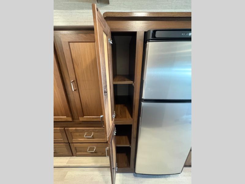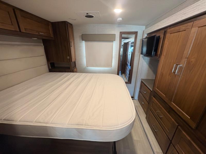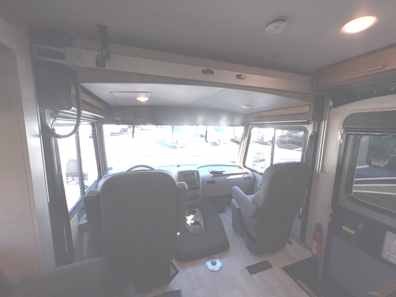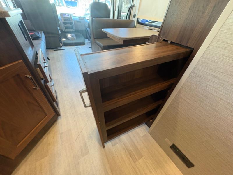 This motorhome will be your home away from home! It features a rear private bedroom with a 60" x 75" queen bed across from a wardrobe and a storage area that is also prepped to add an optional TV. Start and end your days feeling squeaky clean after showering in the 26" x 38" shower, and keep your bellies full with the three burner recessed range and 10 cu. ft. refrigerator, plus there are two pantries to store everyone's favorite snacks. The 42" x 66" dinette with hi-lo table comes with storage to keep your games close, and the 40" x 66" sofa bed can be switched out for the optional theater seating to relax in true comfort while you watch your favorite movies. You can also add an optional StudioLoft powered 48" x 80" bed above the swivel cab seats!