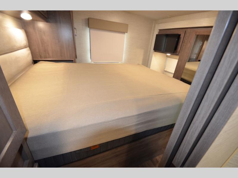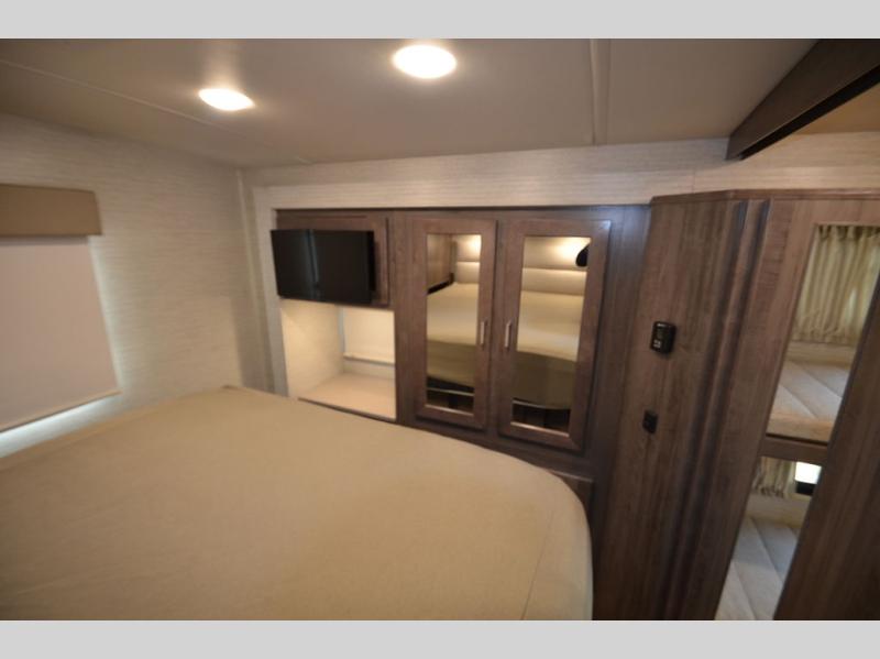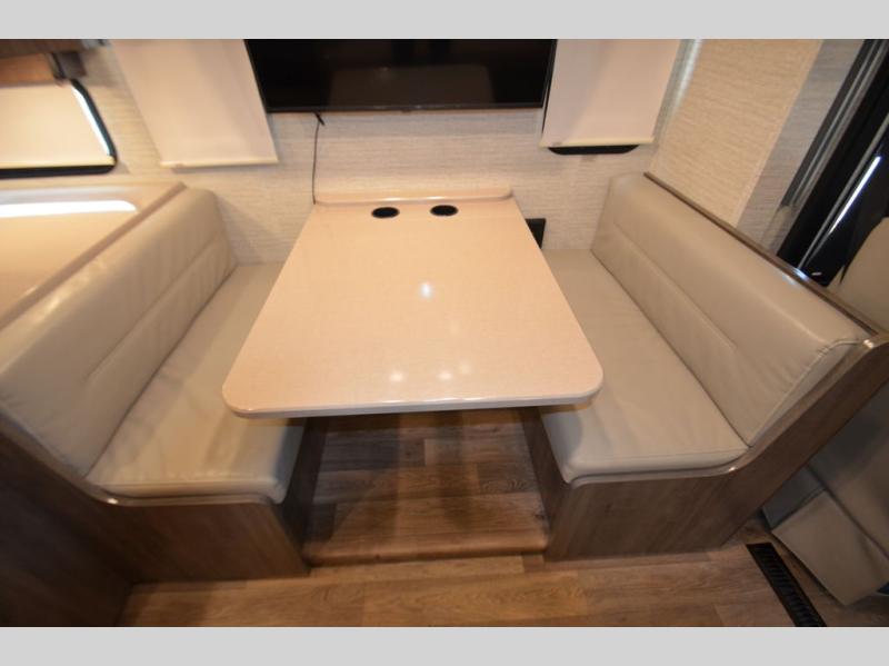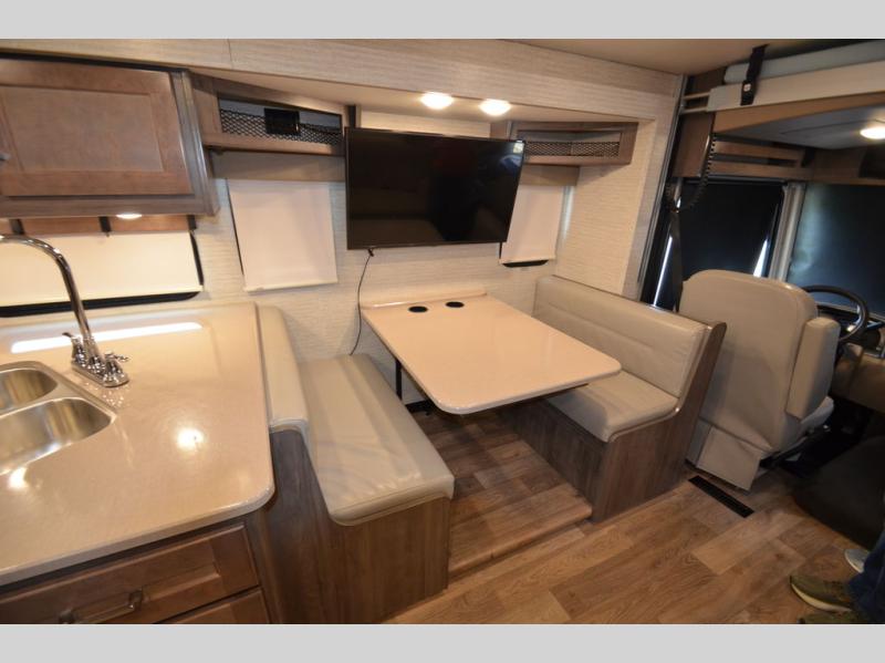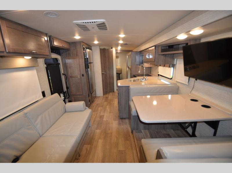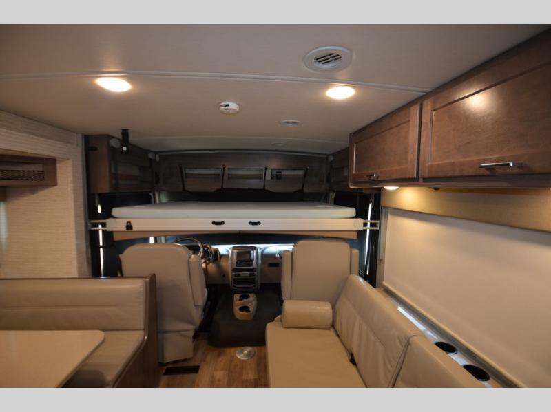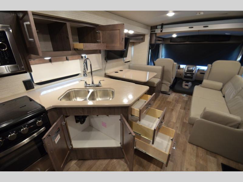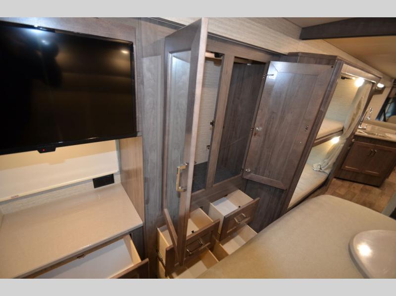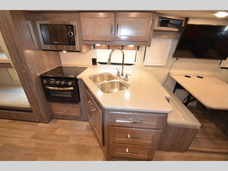 Once you reach your destination with this motorhome, you can start enjoying all of the comforts it provides! From the rear private bedroom with a 60" x 75" bed across from storage and a wardrobe, plus an area prepped to add an optional TV for entertainment in bed. The kiddos will love the 30" x 73" bunk beds and you can even add an optional StudioLoft powered 48" x 80" bed above the swivel cab seats with removable pedestal table. The 40" x 66" sofa bed and 42" x 73" booth dinette with hi-lo table can also transform into extra sleeping spaces when not in use. Your bellies will stay full with the three burner cooktop and your hair will stay clean with the 34" x 34" radius shower in the full bathroom!