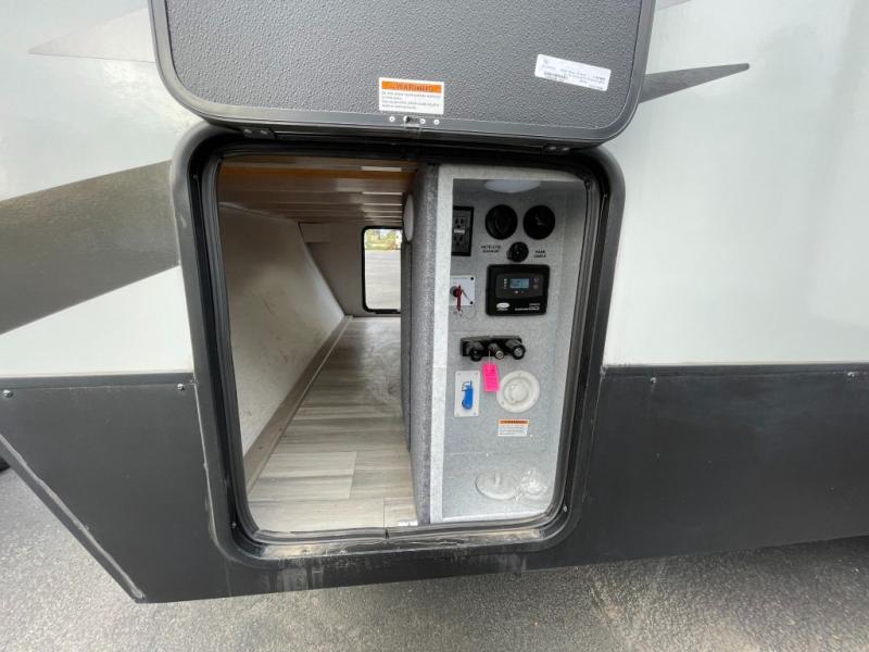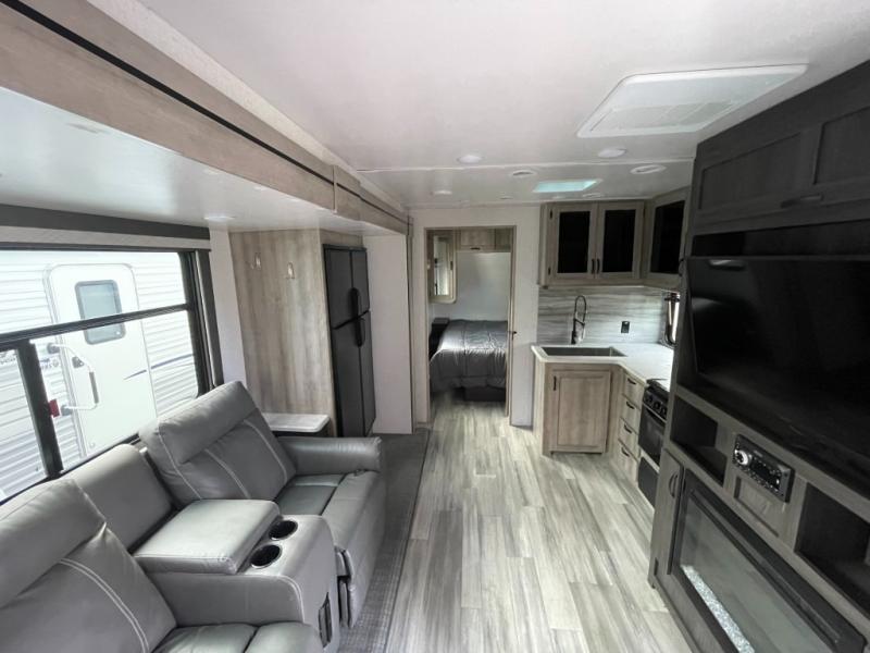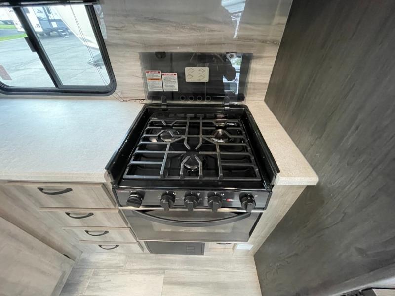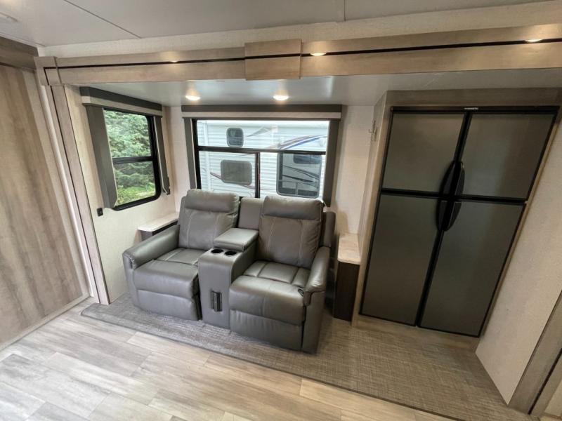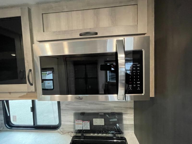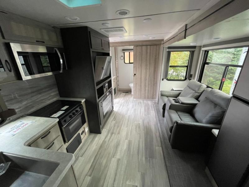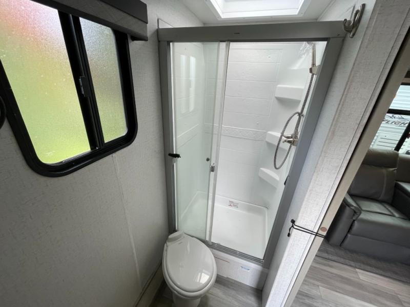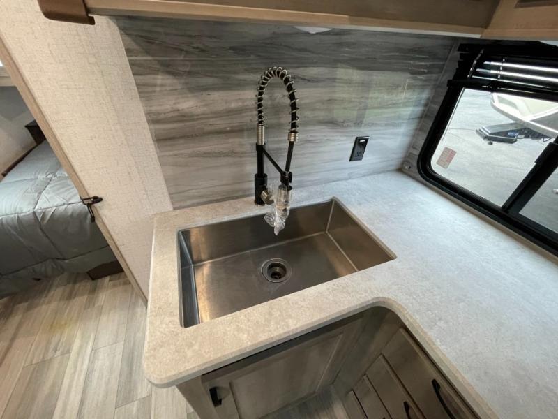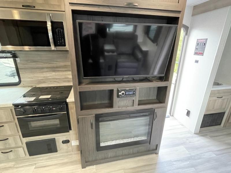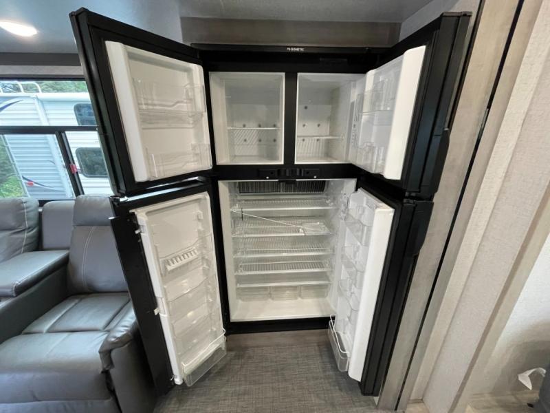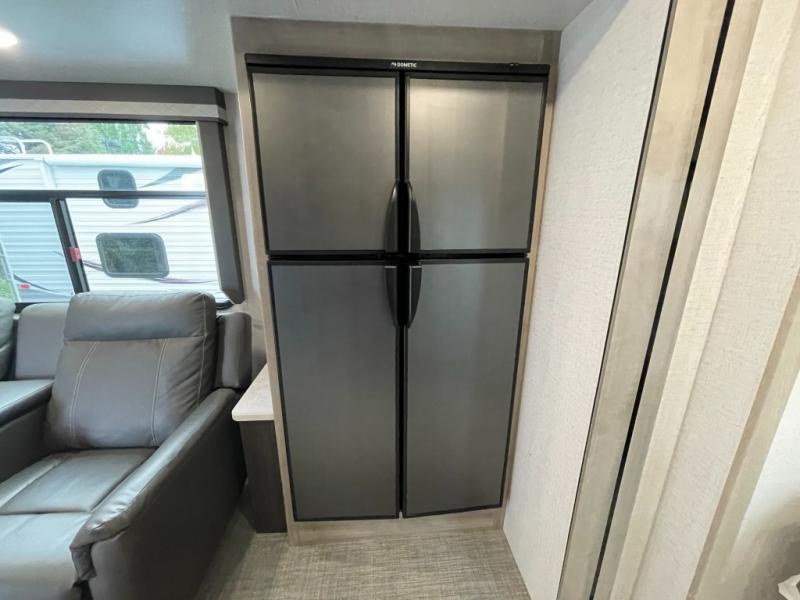 Get ready for adventure from backpacking in the mountains to lounging by the lake, you will be able to do it all when you have these home-like comforts to return to. The front private bedroom provides you with a queen-size bed so that every night is comfortable or choose the king bed option, and the full rear bathroom has a large skylight above the shower and a large medicine cabinet with mirror for your morning routine. Sit back on the tri-fold sofa with sofa table and enjoy the view of the entertainment center. You can also reach into the refrigerator right next to you to grab a little snack if you get hungry, and there is a larger walk-in pantry by the main entry.