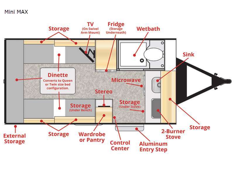 The Mini MAX Stands Out! The 2022 Mini MAX blends compact dimensions with full-featured amenities. It’s thoughtfully designed to feel spacious inside (with a 6' ceiling!) while remaining lightweight and easy to store. It’s the kind of trailer that proves great things do indeed come in small packages.