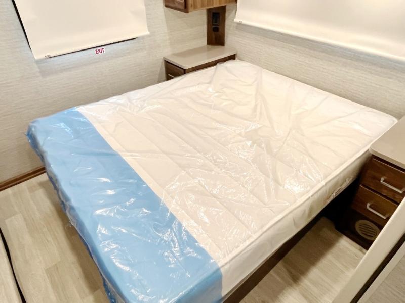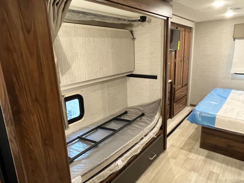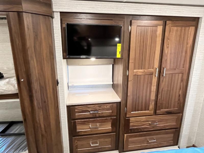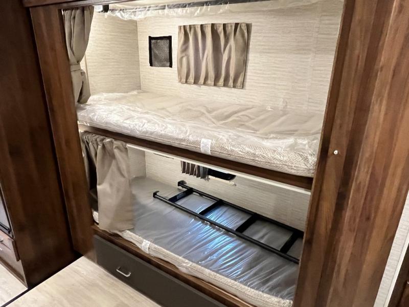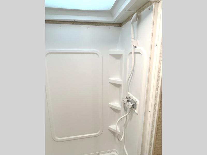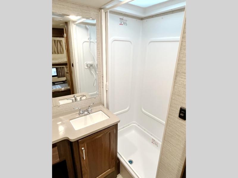 Enjoy plenty of walking around space with two slides in this motorhome! The kids will love having a set of 30" x 73" bunk beds to sleep on at night and there is also a 57" x 95" bunk over cab, a 40" x 70" sofa bed, and a 45" x 74" U-shaped dinette that can be transformed for more friends to tag along. If you don't need that much sleeping space then you could switch out the sofa bed for the optional theater seating. The rear private bedroom has a 60" x 75" queen bed with shirt closets and nightstands on either side, a wardrobe, and a chest of drawers with a TV location for your entertainment. Everyone can stay squeaky clean with the 26" x 38" shower with a skylight for added headroom and natural lighting in the full bathroom!