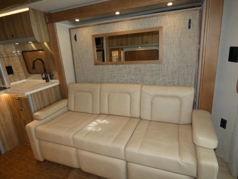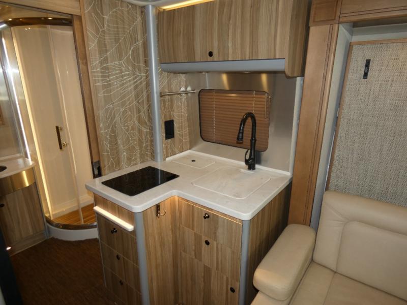 Get ready to explore, unwind and "glamp" where ever you decide! This coach brings you everything you will need, plus much much more! The power slide offers a Murphy suite that retracts and fits seamlessly with the luxury automotive body style. With a touch of a button on the multiplex control panel, you will have more floor space to relax on the reclining sofa that includes two seatbelts or pull down the Murphy bed at night. There is more seating on the captain's chairs that swivel around to face the interior, and there are two tables that adjust to different heights for your needs. The kitchen provides a two-burner gas stove and large stainless steel Kohler sink and faucet, and there is a convection microwave, a slide-out pantry and a refrigerator with a freezer a few steps away.