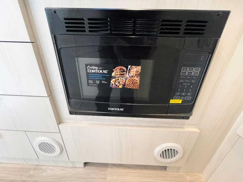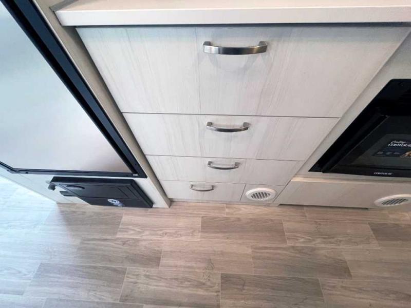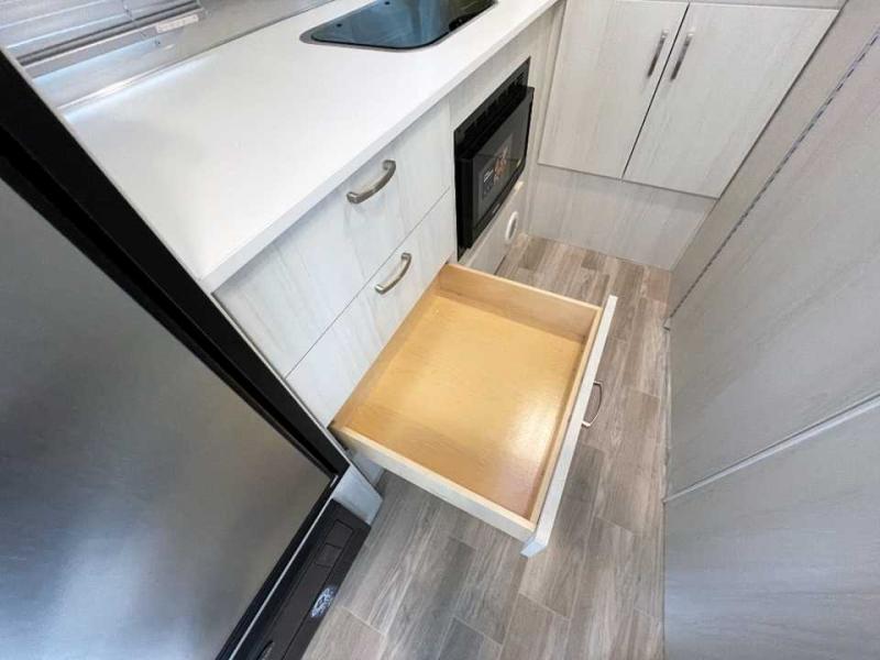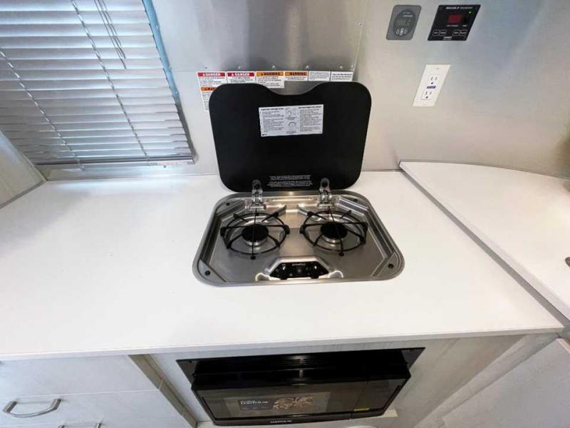 You're going to love every minute in this cozy travel trailer for four. The extra counter space in the rear corner kitchen provides more room to prepare meals, plus there is a two burner LP gas cooktop and a microwave oven to complete this area. The spacious full bath includes a shower with sleek countertops, a stainless steel sink, and cabinet storage for your toiletries. Your guests can sleep on the convertible dinette when it's not being used to dine at, and you'll have the front bed with a pillow top memory foam mattress all to yourselves. There is also a storage closet nearby to keep your clothes wrinkle-free!
