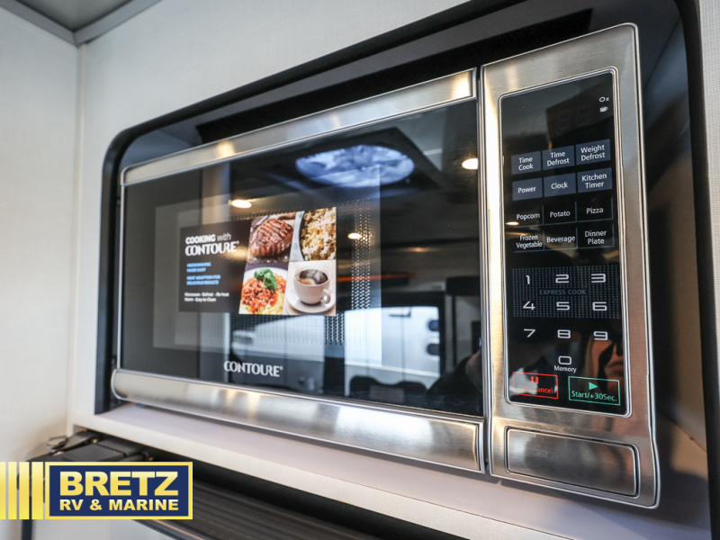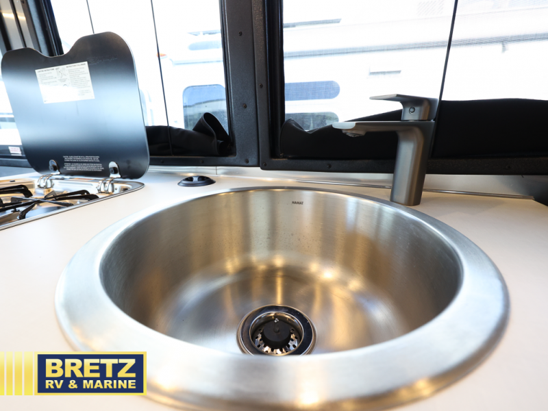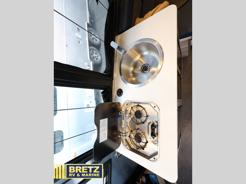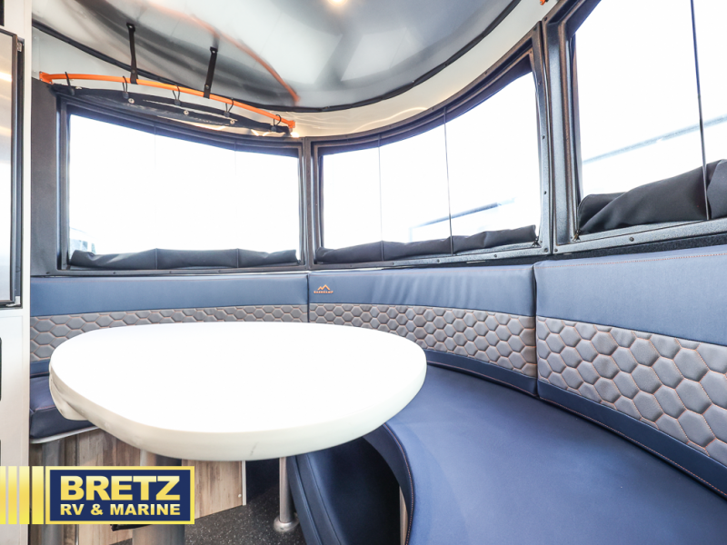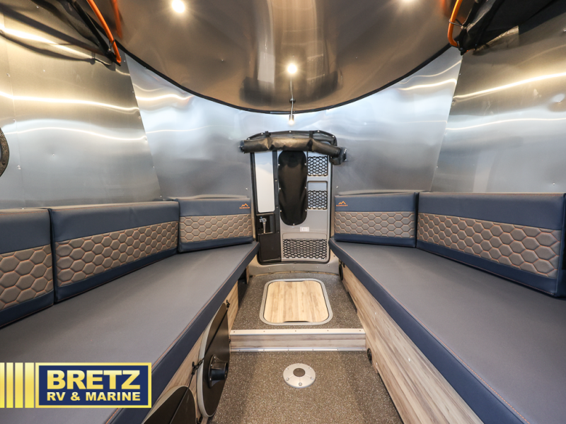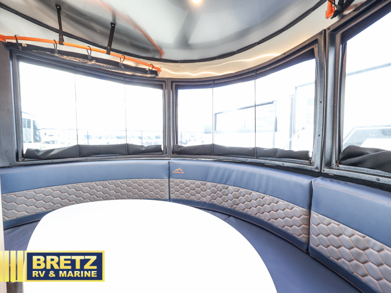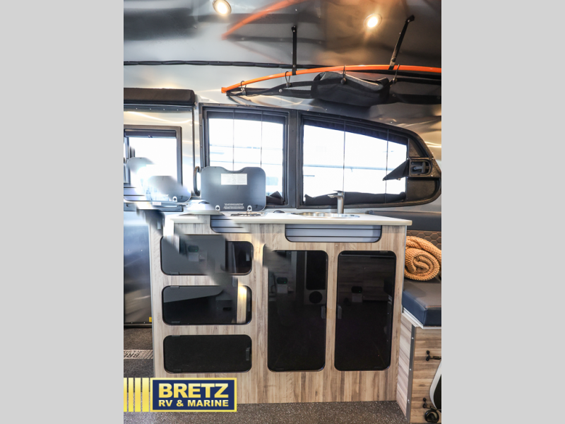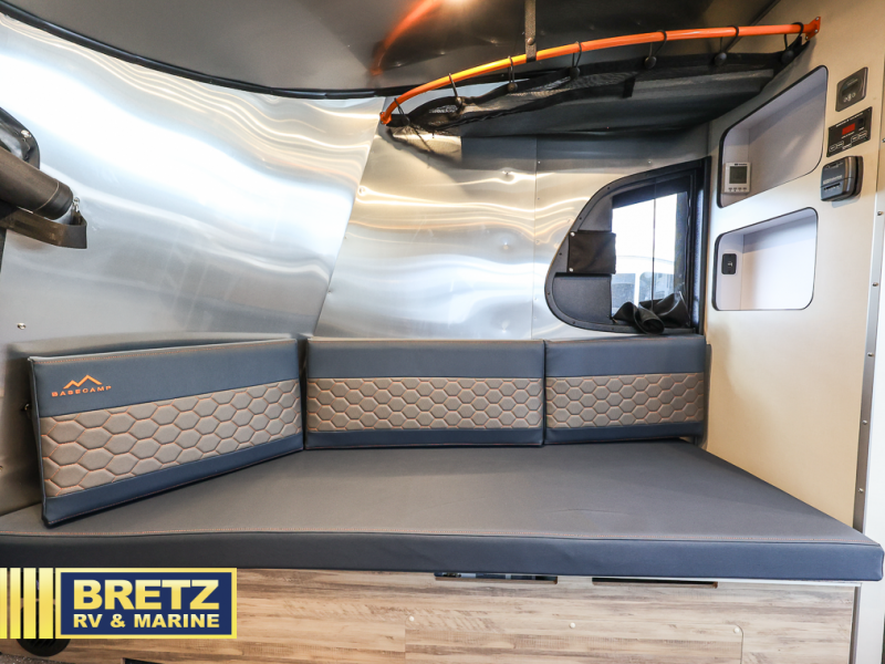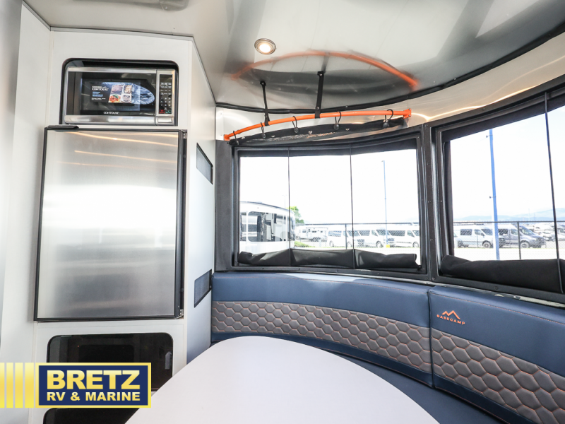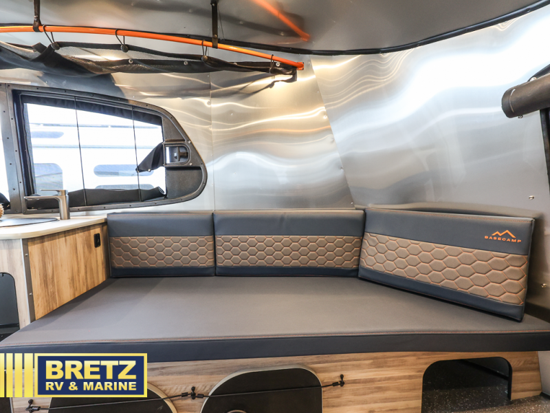 This travel trailer includes the Basecamp X Package that comes with a steel double step, Goodyear off-road tires, and a 3" lift kit for added ground clearance. You can easily sleep everyone when using both the rear benches and the front U-shaped dinette. The benches provide split sleeping or a half-bed on one side and a full bed that spans the back of the trailer into an 82" x 78" area. There is storage under the cushions for the two removable tables that allow you to dine, work and relax with a place for your cellphones and such. The wet bath comes complete with a shower, sink and toilet so you can rinse off from a day outdoors, the galley kitchen gives the cook a place to make warm meals and store drinks and leftovers. This Basecamp also offers front panoramic windows, storage above the propane tanks, solar panel input, and a steel entry step. There is also a full-size spare tire, cast aluminum LED tail light and a rear hatch allowing you to take your snowboards, skis, paddleboards and/or kayaks, plus an exterior shower and optional solar panels.