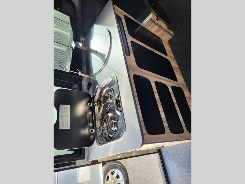 This travel trailer includes the Basecamp X Package that comes with a steel double step, Goodyear off-road tires, and a 3" lift kit for added ground clearance. You can easily sleep everyone when using both the rear benches and the front U-shaped dinette. The benches provide split sleeping or a half-bed on one side and a full bed that spans the back of the trailer into an 82" x 78" area. There is storage under the cushions for the two removable tables that allow you to dine, work and relax with a place for your cellphones and such. The wet bath comes complete with a shower, sink and toilet so you can rinse off from a day outdoors, the galley kitchen gives the cook a place to make warm meals and store drinks and leftovers. This Basecamp also offers front panoramic windows, storage above the propane tanks, solar panel input, and a steel entry step. There is also a full-size spare tire, cast aluminum LED tail light and a rear hatch allowing you to take your snowboards, skis, paddleboards and/or kayaks, plus an exterior shower and optional solar panels.