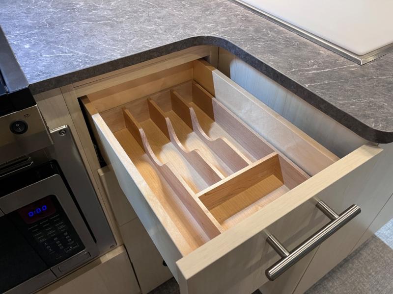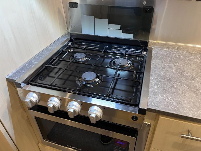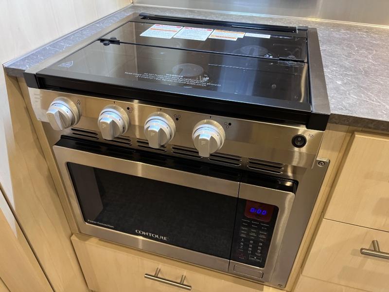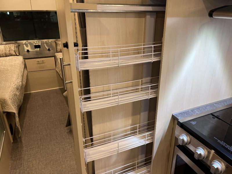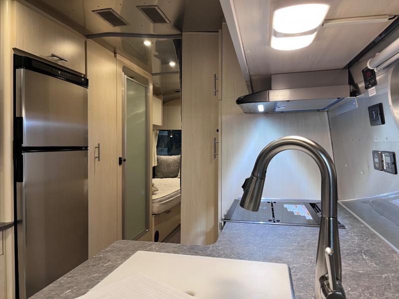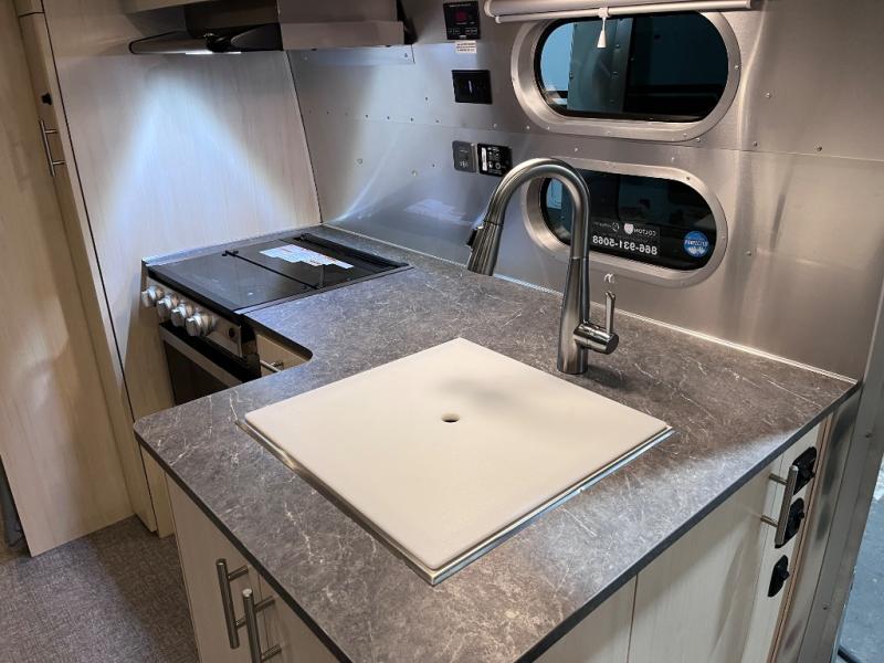 With each Flying Cloud travel trailer by Airstream, there are two axles, and each is built for ease of towing, plus there is a rear-view camera to make reversing and parking easier, and stainless steel front stone guards to protect the lower segments from road debris. The iconic Airstream design is created outside and inside by the semi-monocoque aluminum superstructure, the temperature reducing one-piece white aluminum roof, the panoramic front windows, and the stylish aluminum wheels. The interior will have you feeling right at home with handcrafted cabinetry, plenty of storage and counter space, sleek roller blinds and blackout curtains, plus residential style faucets!