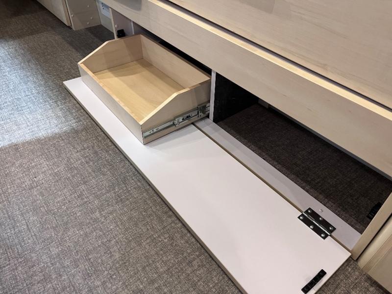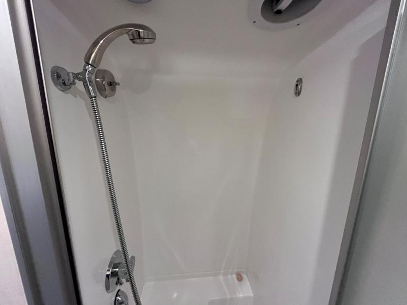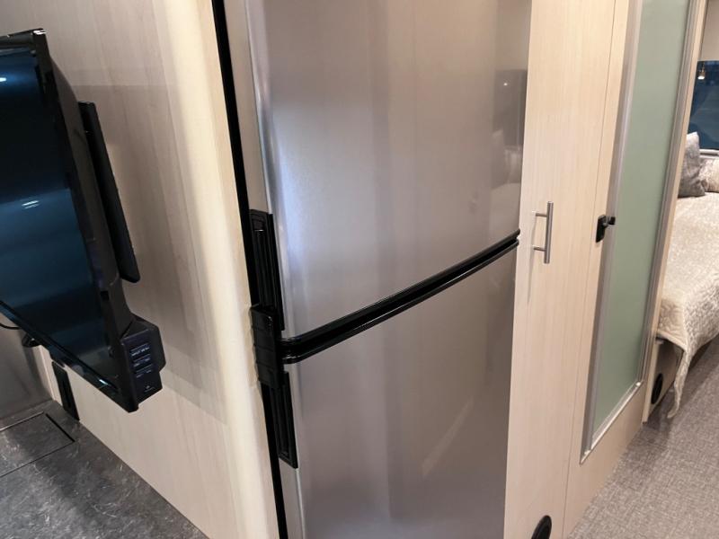 When you enjoy the finer things when traveling, this trailer will provide that for you plus lots of natural lighting and plenty of conveniences. The convertible rear dinette offers a place to dine and socialize for four, and there is a lounging area along the side with a TV on the wall. The table acts as a sturdy base below the cushions when you need some sleeping space. The front bedroom offers more panoramic windows and comfortable twin beds with a view each morning and night. There is floor space in the center and a nightstand for extra storage and charging space. You will find storage for your clothing, and a split bathroom with a half bath on one side and a shower that stands independently across the hall. And the kitchen offers everything you need to make meals including extra counter space and a refrigerator for leftovers. And there is a rear hatch option for this trailer.