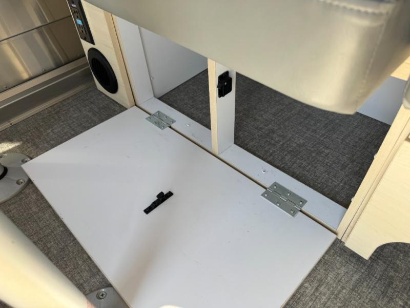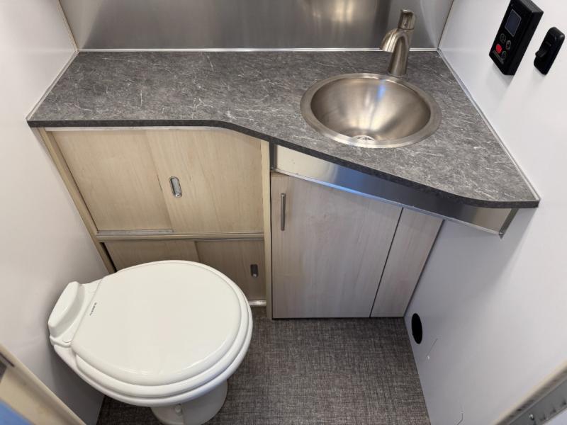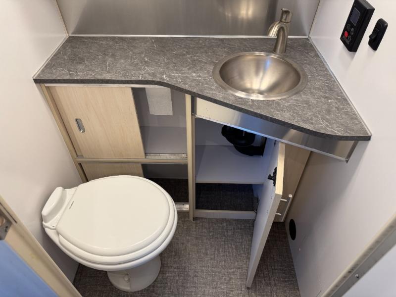 When you enjoy the finer things when traveling, this trailer will provide that for you plus lots of natural lighting and plenty of conveniences. The convertible rear dinette offers a place to dine and socialize for four, and there is a lounging area along the side with a TV on the wall. The table acts as a sturdy base below the cushions when you need some sleeping space. The front bedroom offers more panoramic windows and a comfortable queen bed with a view each morning and night. You will find storage for your clothing, and a split bathroom with a half bath on one side and a shower that stands independently across the hall. And the kitchen offers everything you need to make meals including extra counter space and a refrigerator for leftovers. And there is a rear hatch option for this trailer.