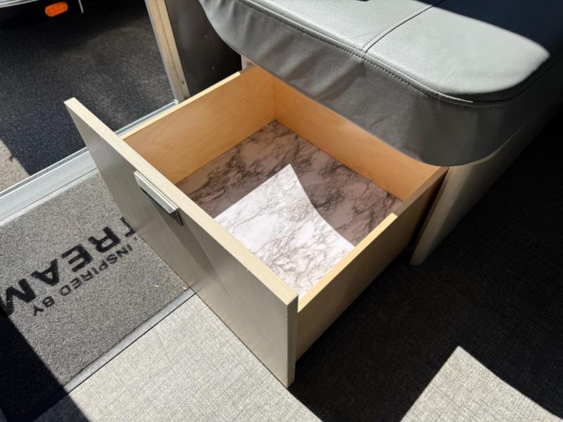 With each Flying Cloud travel trailer by Airstream, there are two axles, and each is built for ease of towing, plus there is a rear-view camera to make reversing and parking easier, and stainless steel front stone guards to protect the lower segments from road debris. The iconic Airstream design is created outside and inside by the semi-monocoque aluminum superstructure, the temperature reducing one-piece white aluminum roof, the panoramic front windows, and the stylish aluminum wheels. The interior will have you feeling right at home with handcrafted cabinetry, plenty of storage and counter space, sleek roller blinds and blackout curtains, plus residential style faucets!