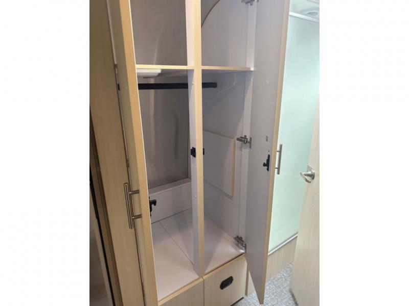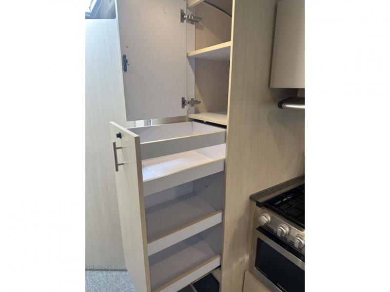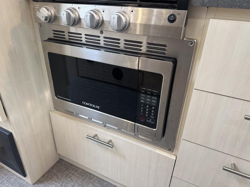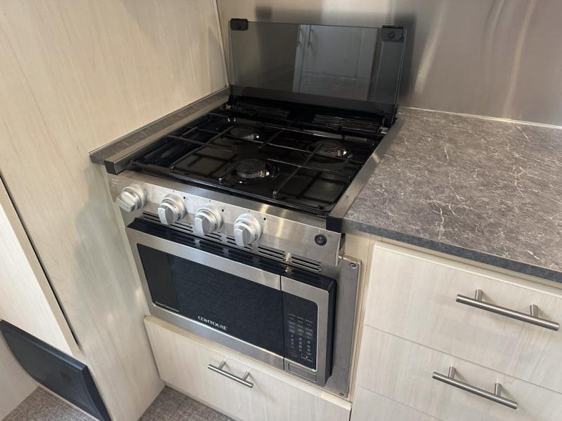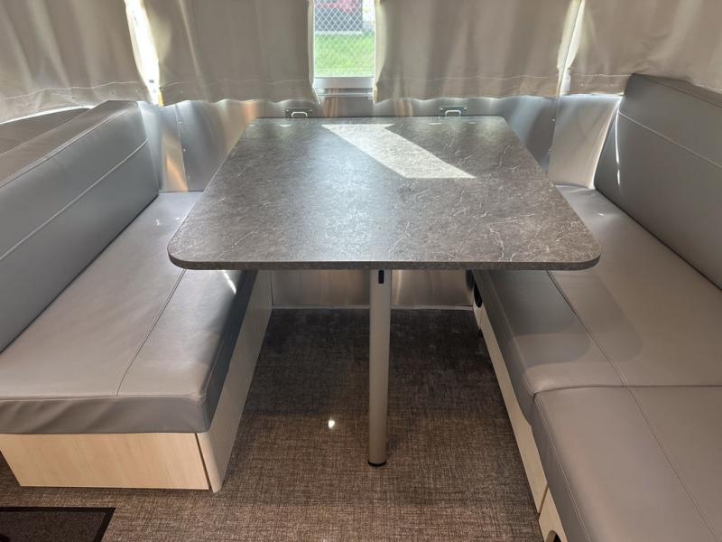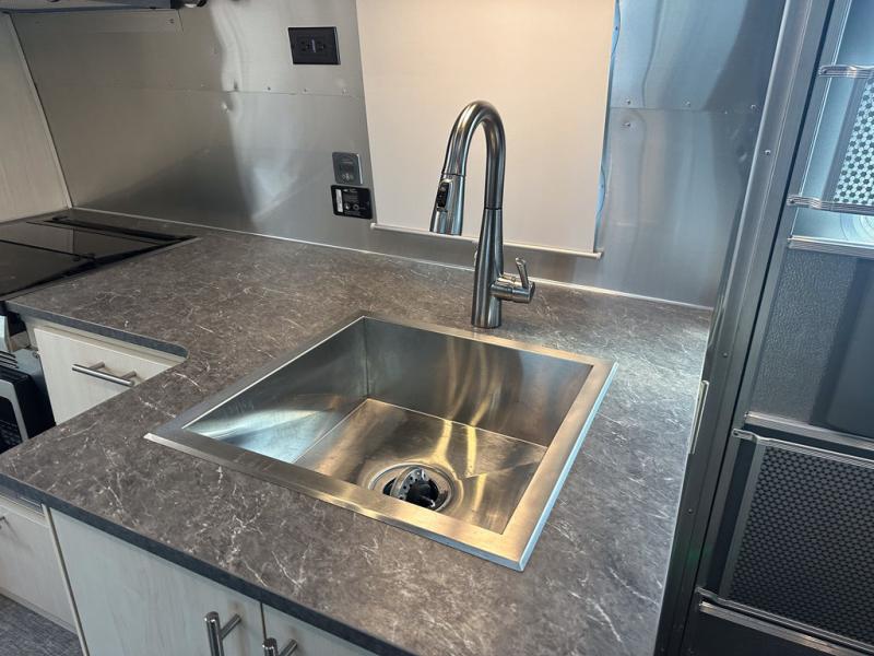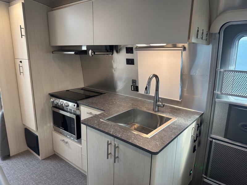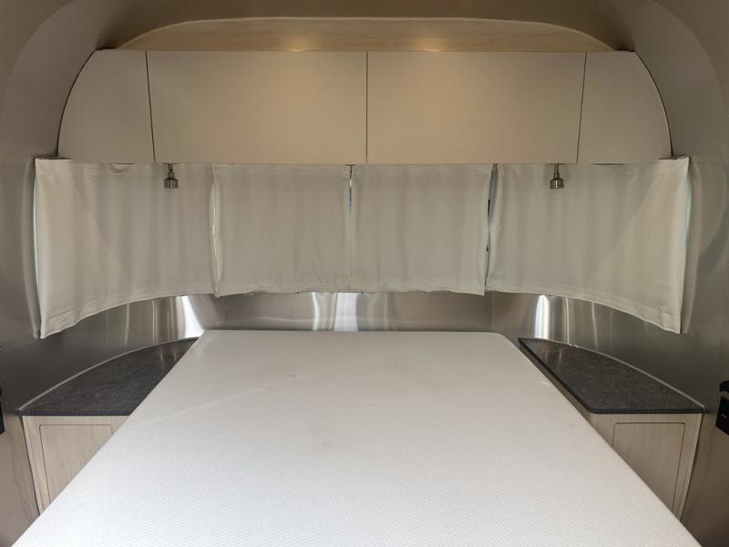 With each Flying Cloud travel trailer by Airstream, there are two axles, and each is built for ease of towing, plus there is a rear-view camera to make reversing and parking easier, and stainless steel front stone guards to protect the lower segments from road debris. The iconic Airstream design is created outside and inside by the semi-monocoque aluminum superstructure, the temperature reducing one-piece white aluminum roof, the panoramic front windows, and the stylish aluminum wheels. The interior will have you feeling right at home with handcrafted cabinetry, plenty of storage and counter space, sleek roller blinds and blackout curtains, plus residential style faucets!