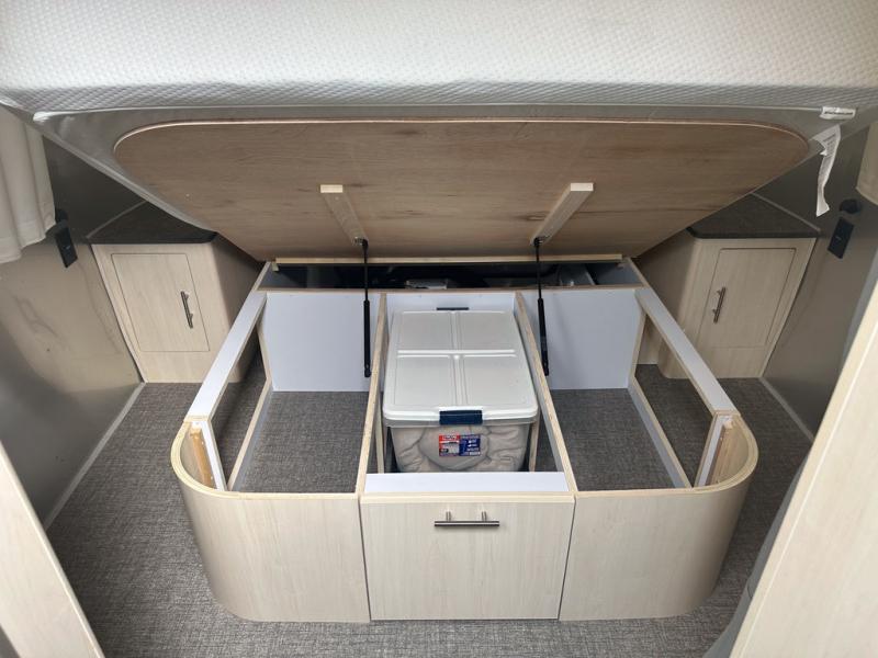 Whether you stay at a campground or an RV park, you will love relaxing inside on the comfortable furniture and the pillowtop memory foam mattress while gazing out all the windows and enjoying the natural lighting. The front master bedroom offers two nightstands for perfect storage for small items and books, and the counters are perfect for displaying accessories and charging devices, while the dinette and lounging area can easily be converted into sleeping space when you have guests stay the night. The toilet and vanity are separate from the shower allowing two people to use the facilities at once. And the cook will have a spacious galley to make meals using the stove/microwave area with square sink, and the refrigerator can hold the leftovers that is opposite the stove. And you might even like to add a few options such as a front bunk option over the queen bed, an optional rear hatch and/or a window awning package.