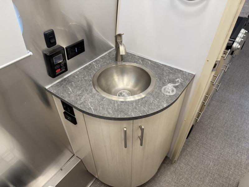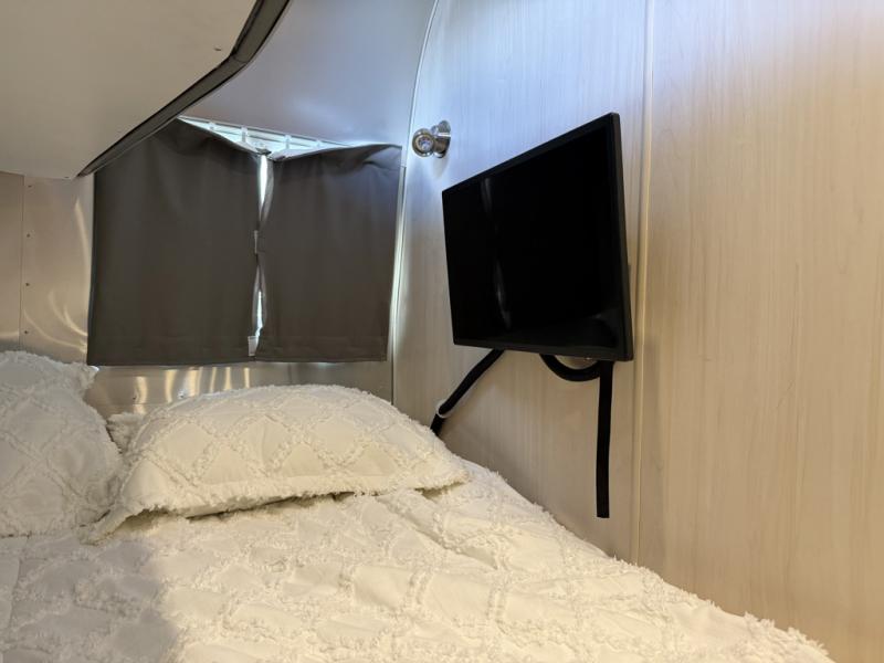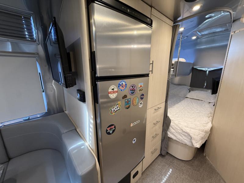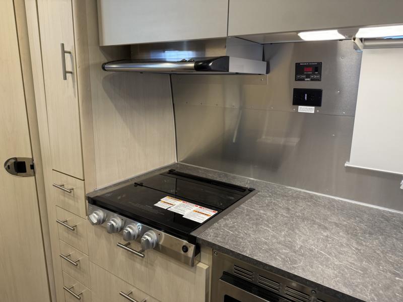 With each Flying Cloud travel trailer by Airstream, there are two axles, and each is built for ease of towing, plus there is a rear-view camera to make reversing and parking easier, and stainless steel front stone guards to protect the lower segments from road debris. The iconic Airstream design is created outside and inside by the semi-monocoque aluminum superstructure, the temperature reducing one-piece white aluminum roof, the panoramic front windows, and the stylish aluminum wheels. The interior will have you feeling right at home with handcrafted cabinetry, plenty of storage and counter space, sleek roller blinds and blackout curtains, plus residential style faucets!