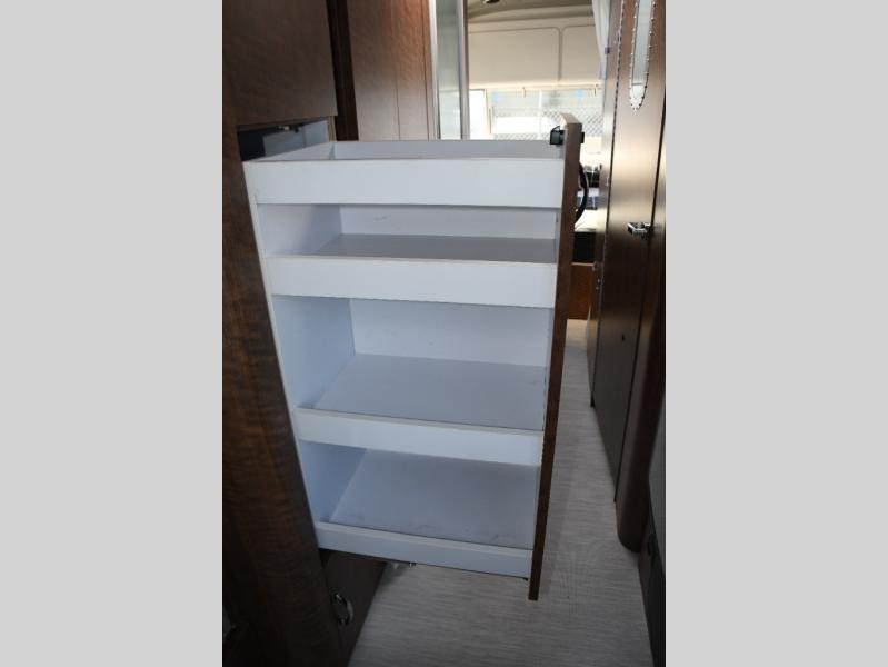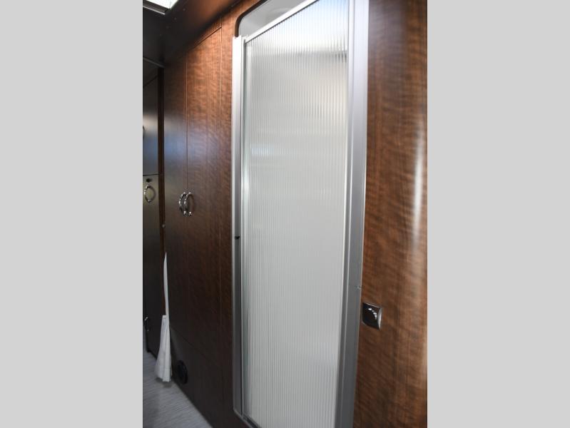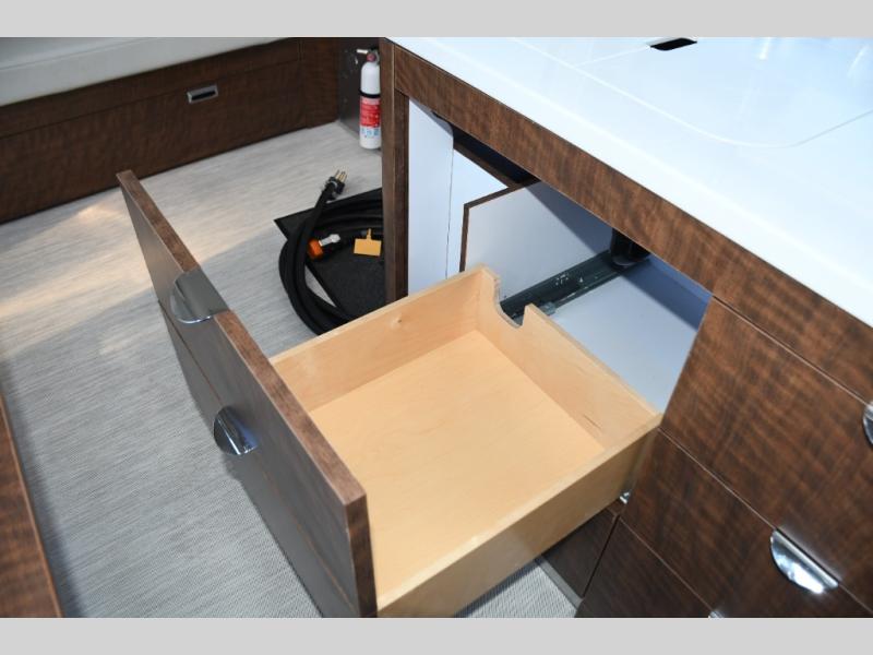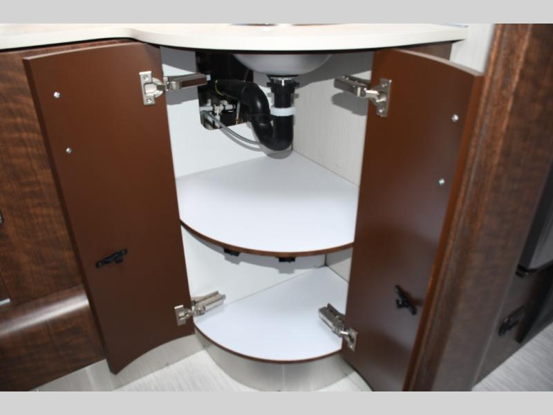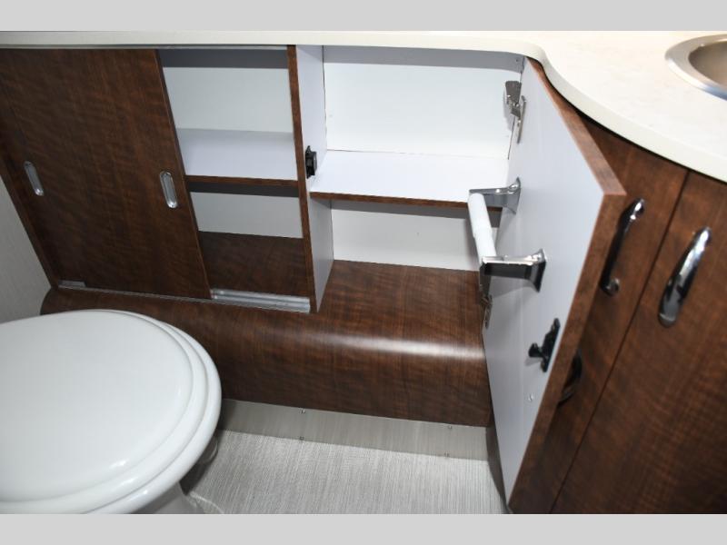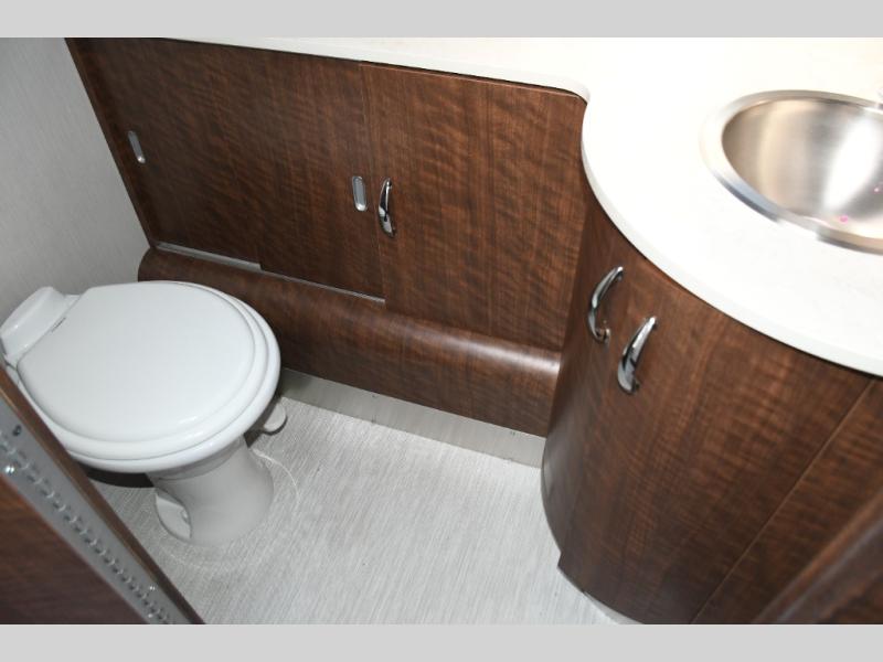 The well-appointed galley kitchen includes quality appliances, solid countertops, and smart storage, making meal preparation on the road both easy and enjoyable. Whether it’s coffee in the morning or dinner after a day of exploring, you’ll appreciate the thoughtful layout and premium materials. The full bathroom with separate shower and well-designed fixtures adds everyday convenience that enhances longer journeys.
