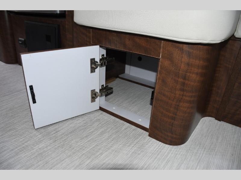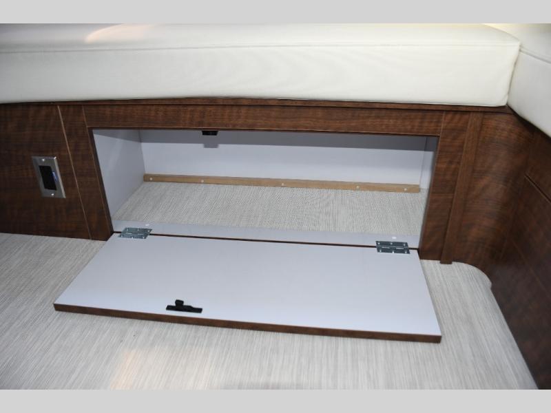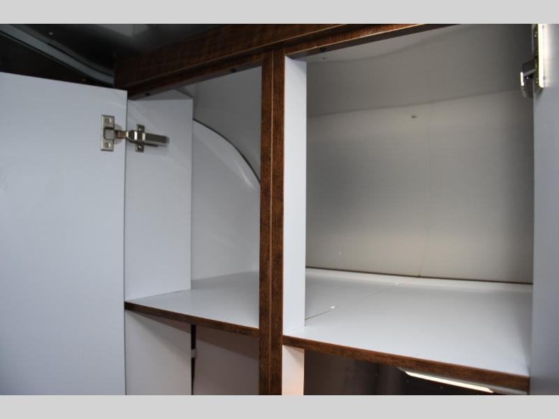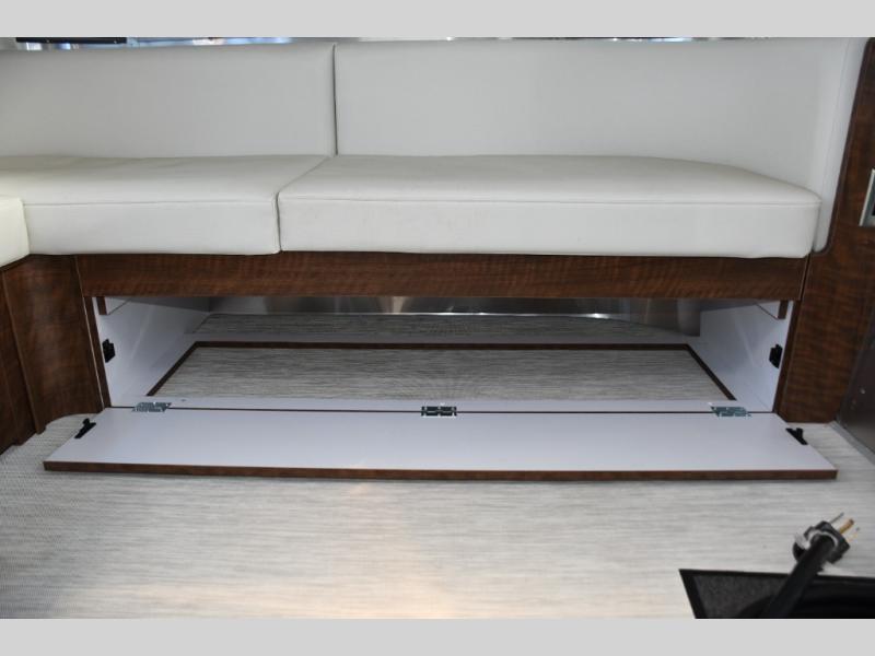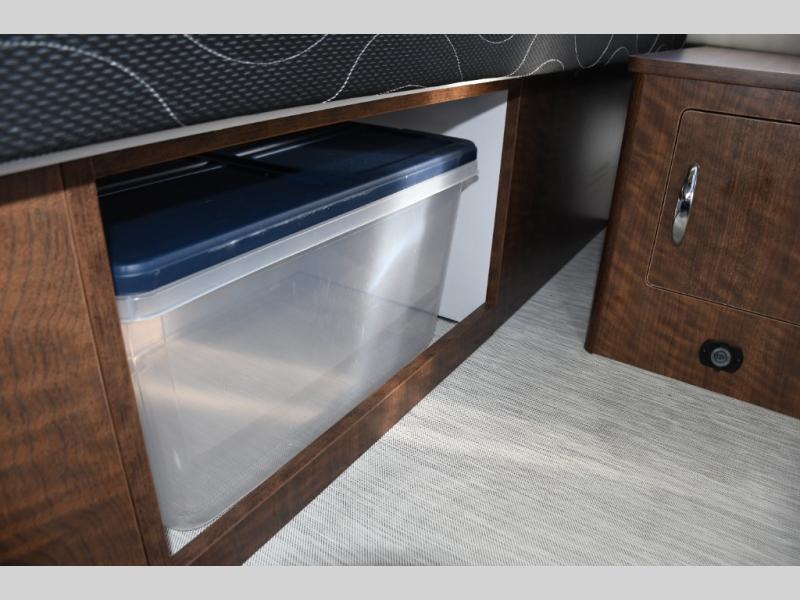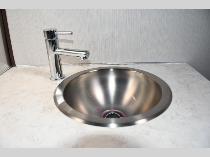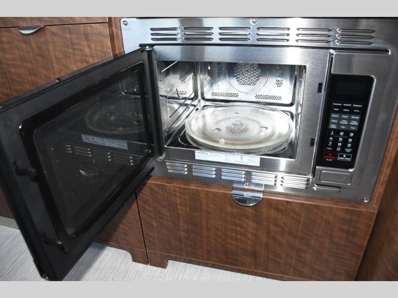 The well-appointed galley kitchen includes quality appliances, solid countertops, and smart storage, making meal preparation on the road both easy and enjoyable. Whether it’s coffee in the morning or dinner after a day of exploring, you’ll appreciate the thoughtful layout and premium materials. The full bathroom with separate shower and well-designed fixtures adds everyday convenience that enhances longer journeys.