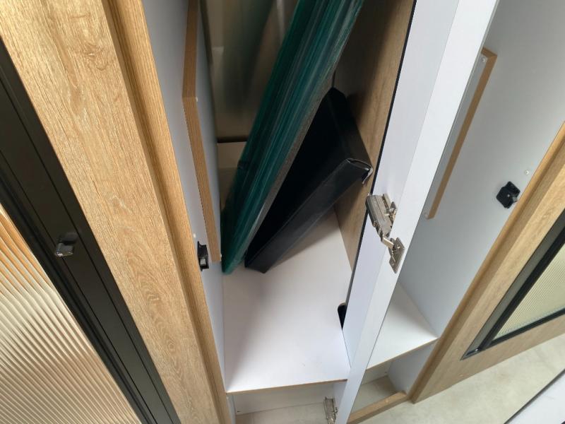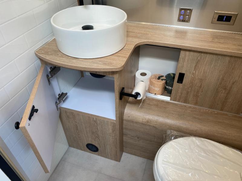 You will be astounded by this design-focused Pottery Barn Special Edition travel trailer! The ready-to-camp accessories make this trailer extremely functional. Some of those features are the Pottery Barn 16-piece dinnerware set, 20-piece flatware set, 4-piece set of marble cheese knives, folding bistro table, and set of two folding chairs. The Fusion touchscreen stereo with surround sound and subwoofer will help you set the mood for relaxing, and the Pottery Barn colossal handknit throw will help you cozy up on the couch. In the private bedroom, you'll find canvas storage bins that you can use to keep all of your belongings easily accessible, LED reading lights, a wardrobe with hanging bar, blackout pleated curtains for the panoramic windows, and an LED HDTV for entertainment. The residential bathroom is quite impressive with its sconce lighting, removable Moen handheld shower head, reeded glass shower door, retractable clothes line, and round mirror with two-shelf medicine cabinet.