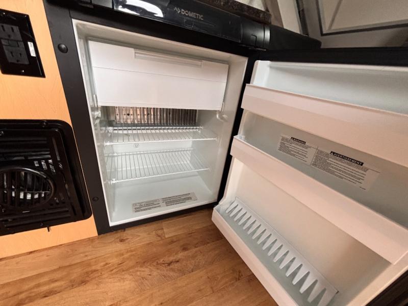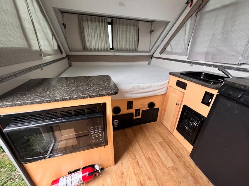 Pack your bags and be on the road in no-time with this lightweight A-frame camper that can sleep three people. You'll enjoy having a 60" x 76" permanent bed with storage underneath for your shoes or bags, and if you have a guest sleep over, they can sleep on the dinette that converts to a 46" x 76" bed. Whip up a hearty lunch on the two burner in/out stove, or use the convenient microwave oven. There is also a 3.0 cu. ft. 2-way refrigerator for perishables and additional storage space for dry goods.