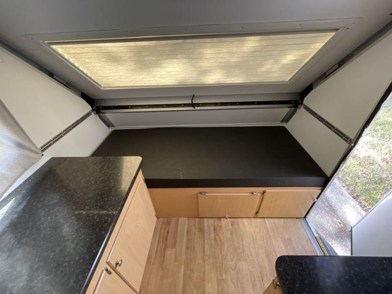 When all you need is the basics to camp because you prefer to be outdoors hiking and exploring, this Scout Lite will be perfect for you! There is sleeping space on either the front 30" x 76" bunk or the rear dinette which converts into a 40" x 76" bed. There is plenty of storage throughout between the storage under the dinette seats, a storage area across from the sink, and storage next to the sink. And you can keep everything charged with the two electrical outlets inside and the one exterior electrical outlet!