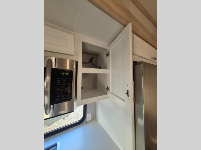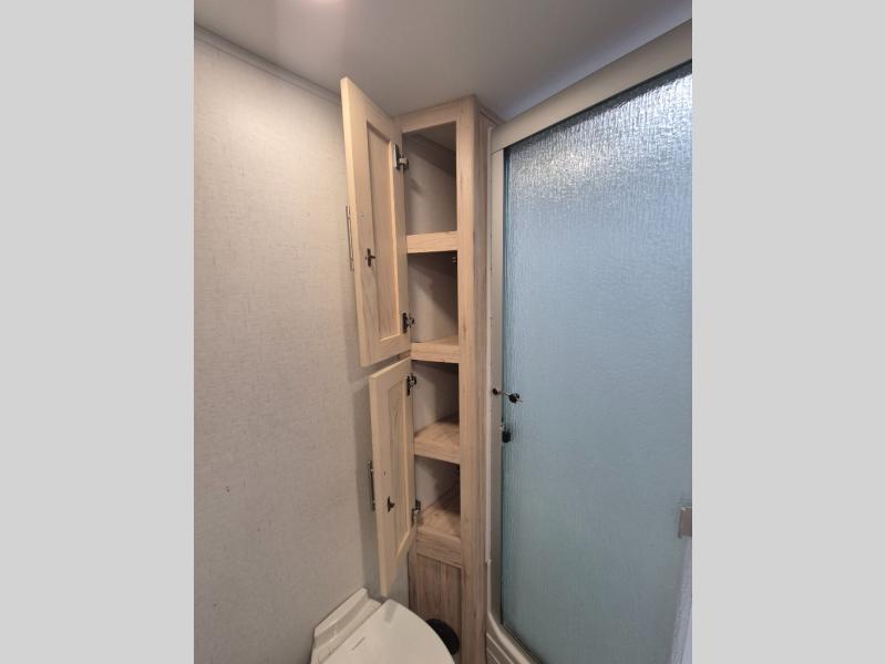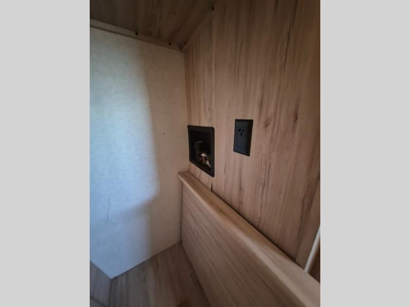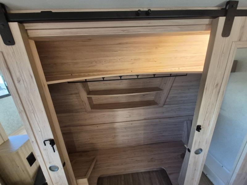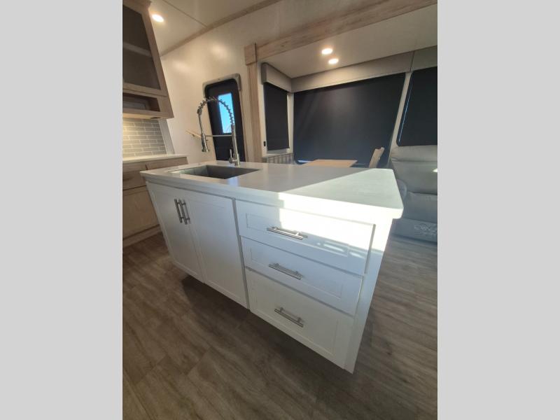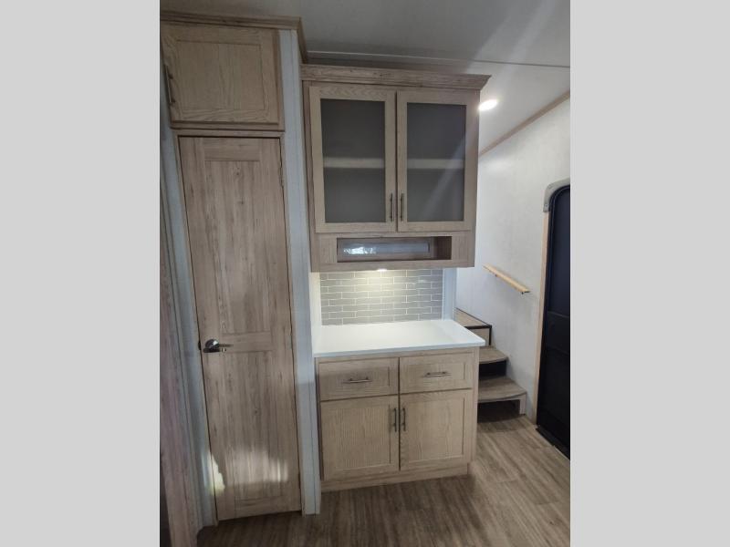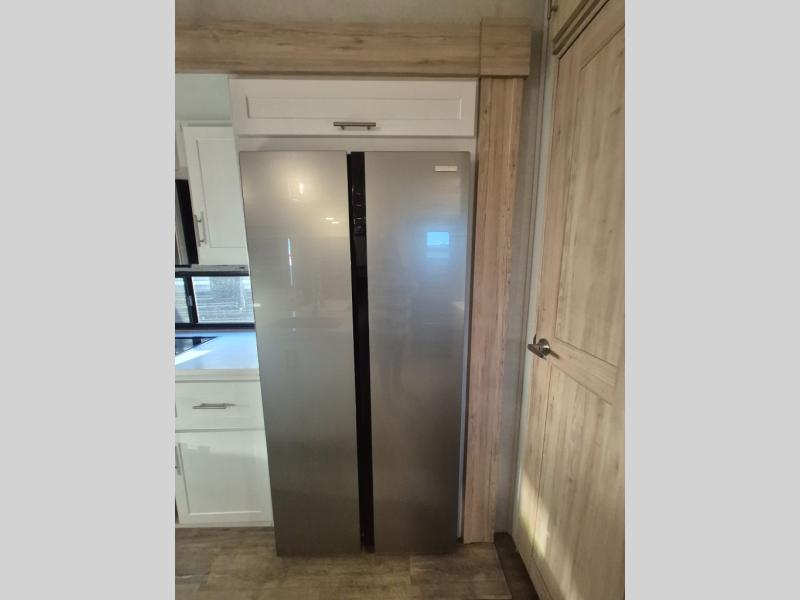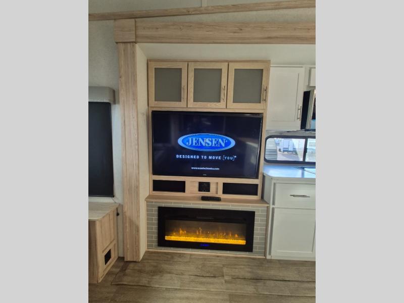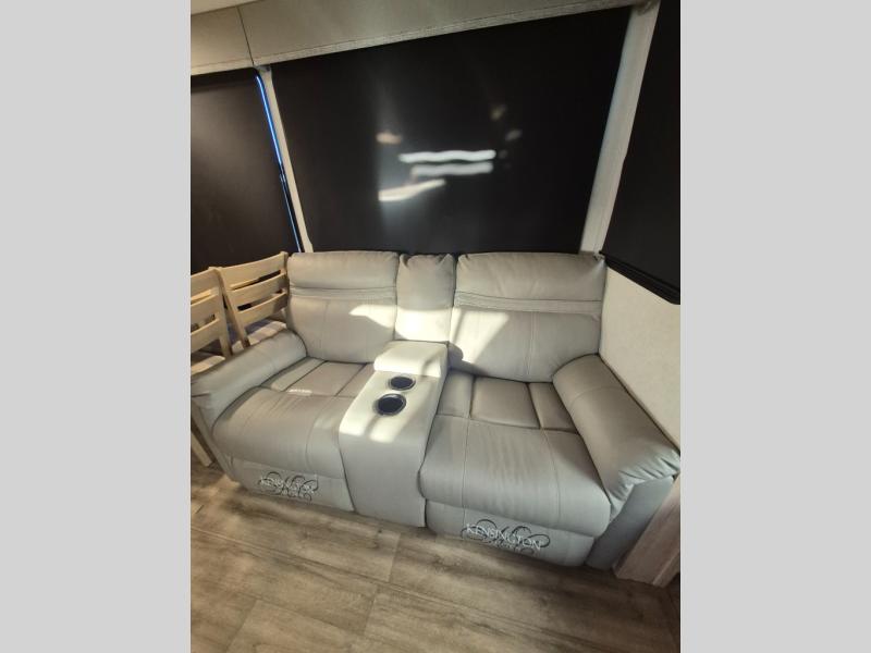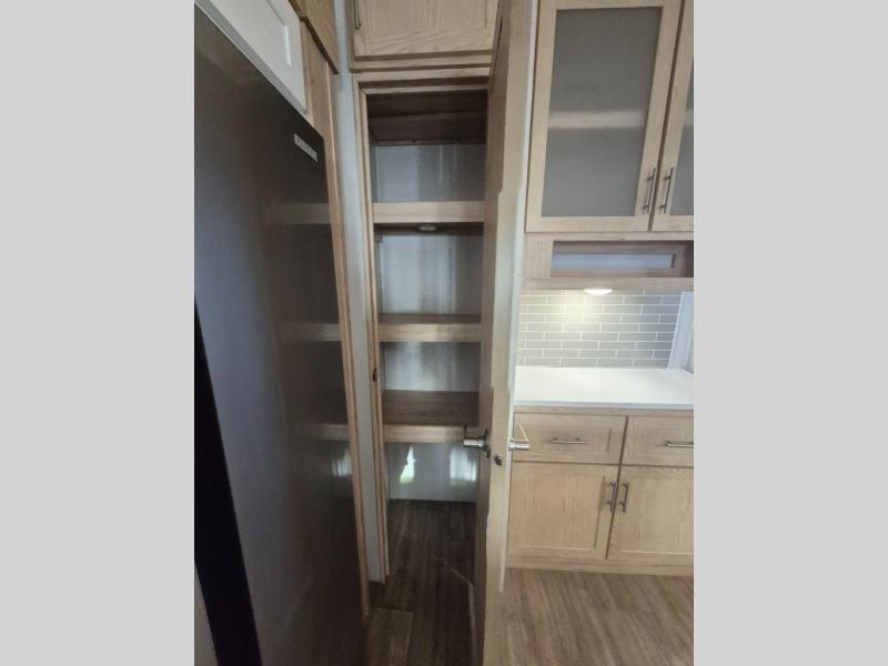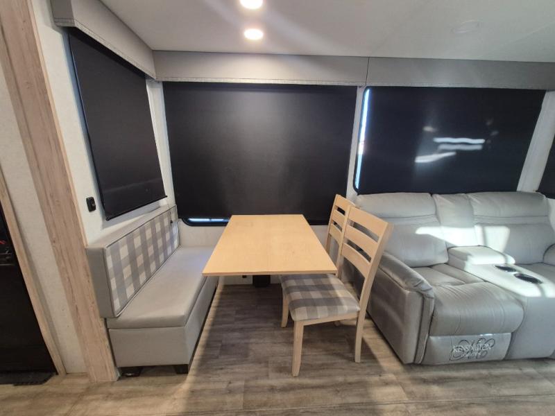 A kitchen island with countertop space makes it easy to prepare meals in this fifth wheel! The floating dinette table has two chairs on one side and a movable ottoman with flip up storage on the other side to keep your games or extra table cloths in. You can store your dishes and snacks inside the hutch/pantry or in the second pantry. The front private bedroom has a queen bed slide but can be switched out for the optional king bed if you like. There is also a dresser and large wardrobe for storage, and either side of the wardrobe has been prepped for a washer and dryer which you could add for those extended trips. The rear living area has dual recliner theater seating across from an entertainment center which has a 50" class HDTV with hidden storage behind it and is also on a swing mount for all to see even at the rear sleeper sofa!