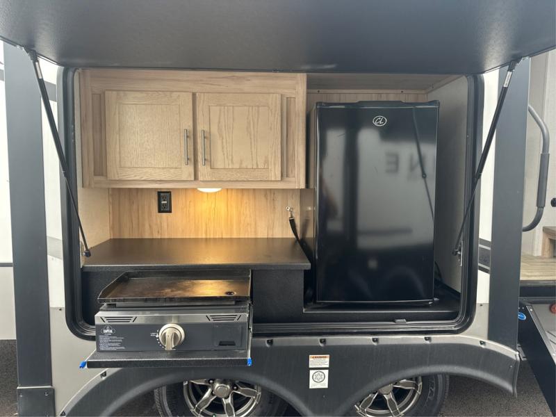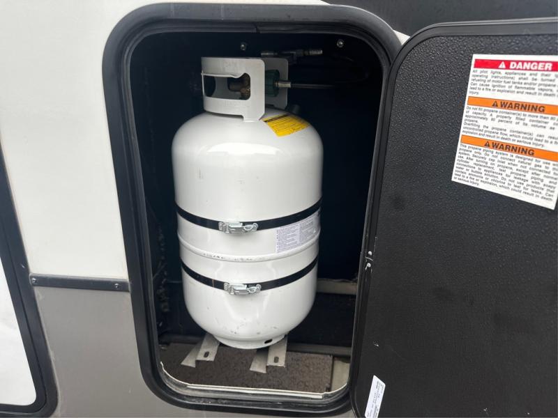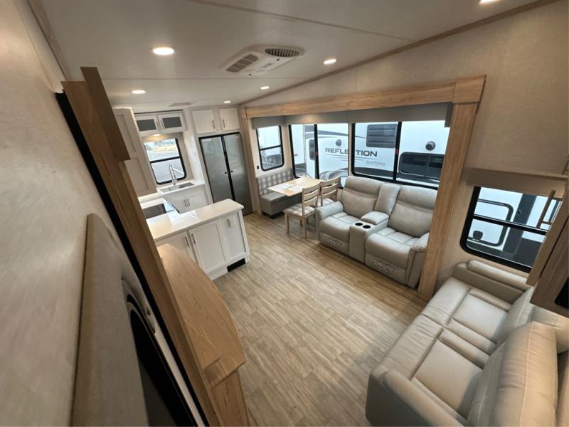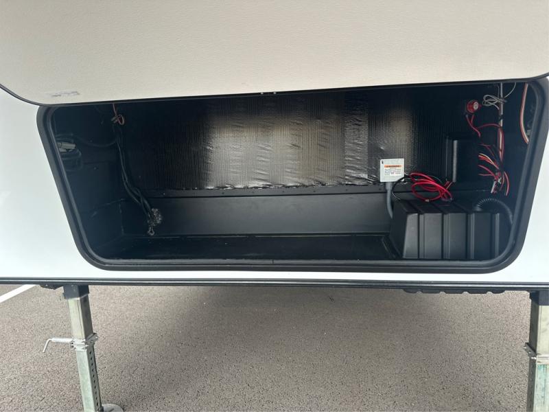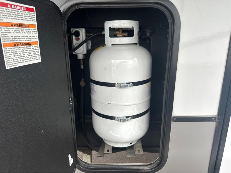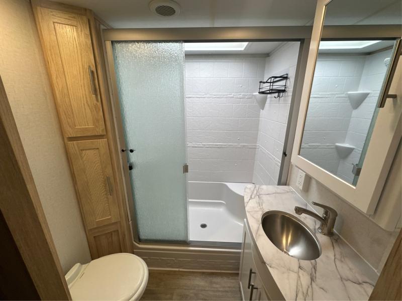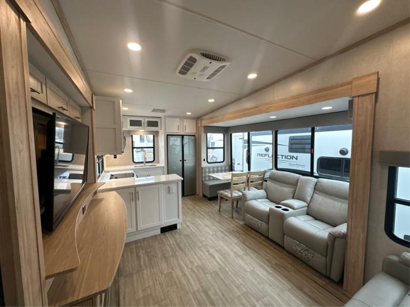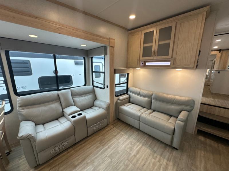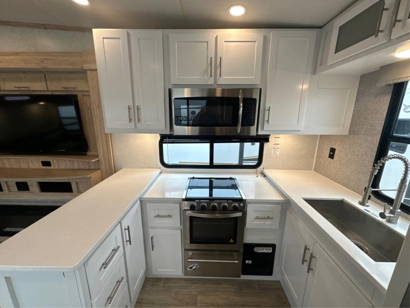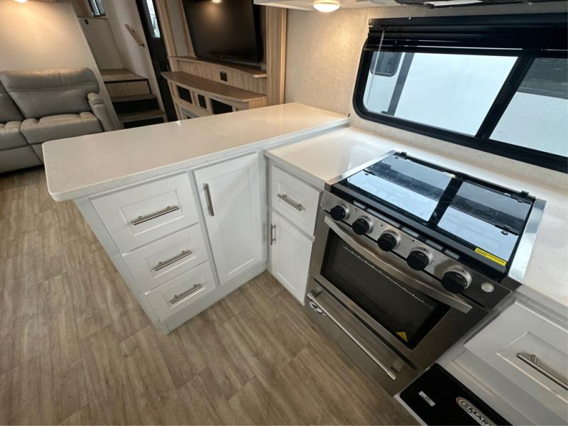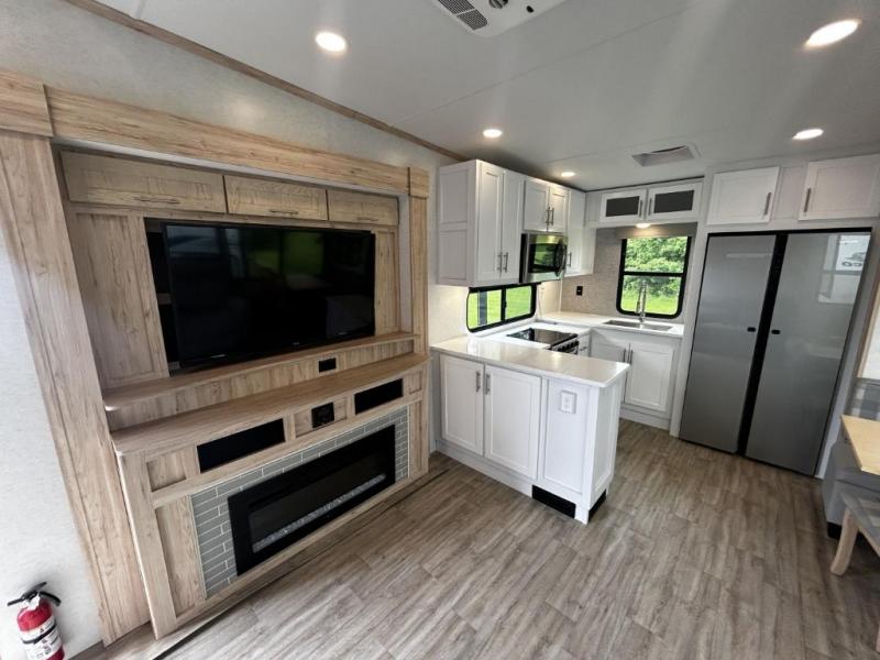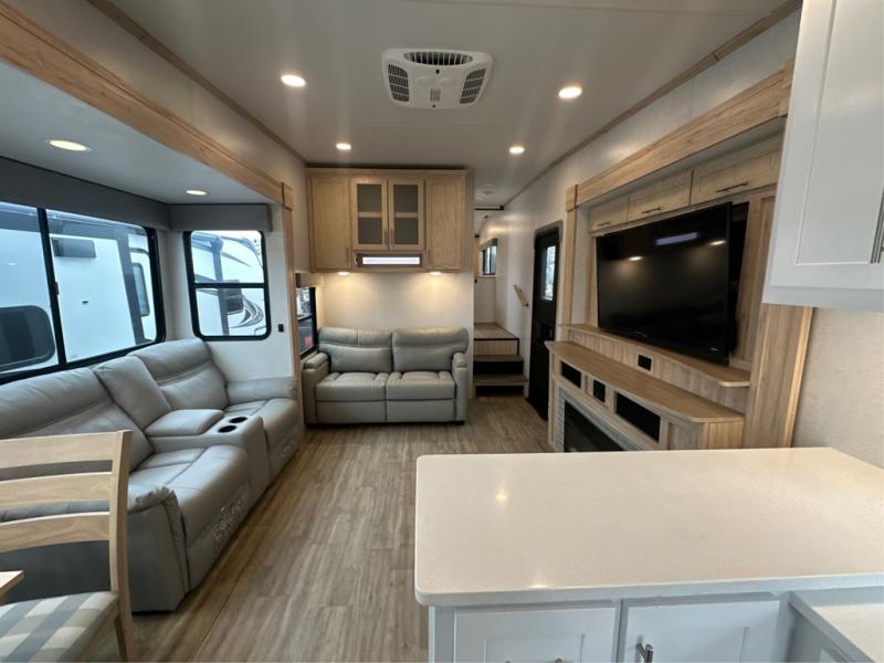 If you've been on the search for a luxury fifth wheel, this is the one! You'll love the rear kitchen with ample counter space, a 16 cu. ft. 12V refrigerator, plus a large sink to clean up. The swing-mount 50" HDTV will provide entertainment for your family while you relax on the dual recliner theater seat or tri-fold sofa. Freshening up each day will be a breeze in the full bath that includes a shower with a seat, and the front private bedroom is close by for convenience. You'll have the queen bed all to yourselves with an option to choose a king bed instead. And check out the large front closet with washer and dryer prep. Going full-time has never been easier!