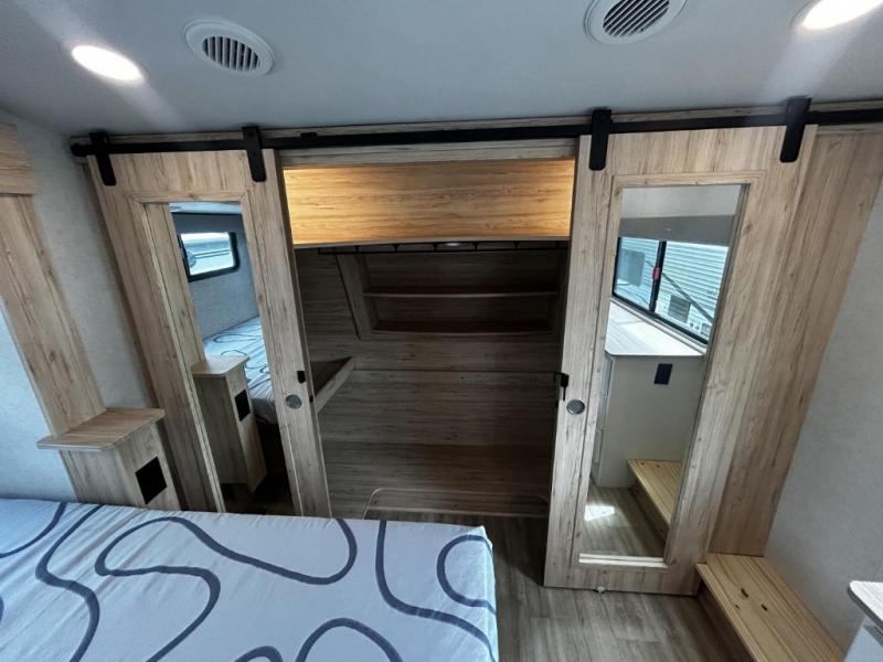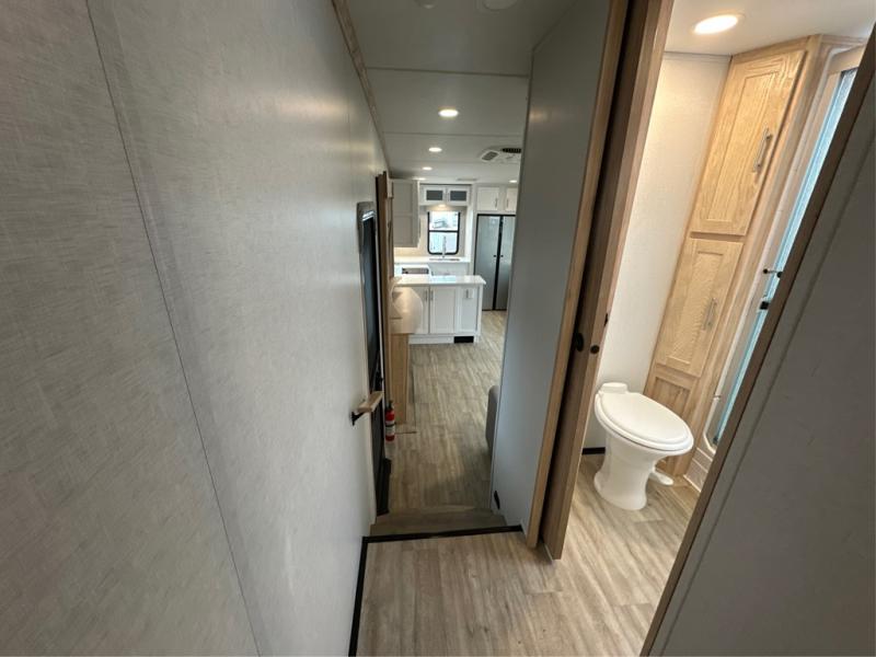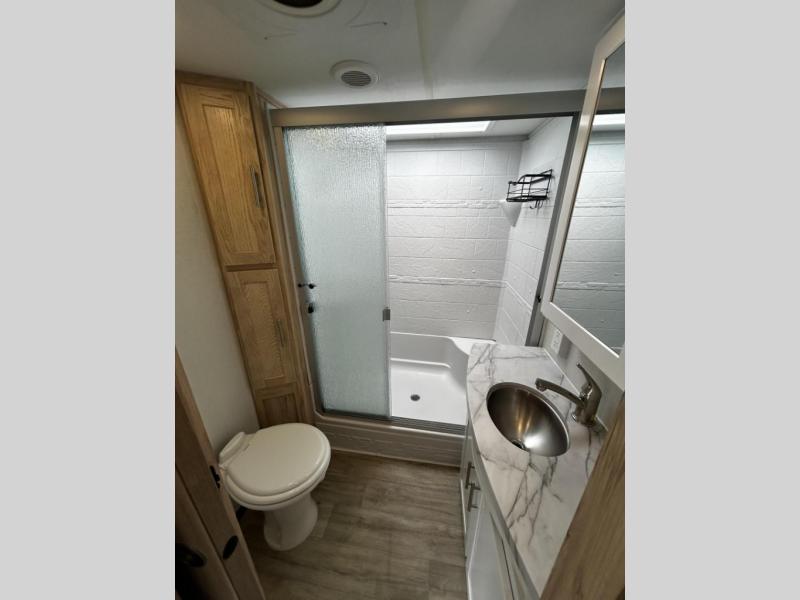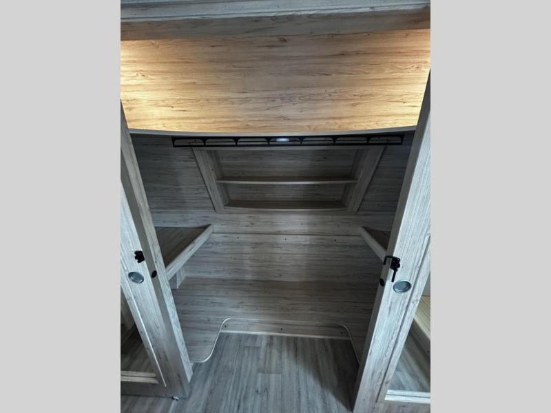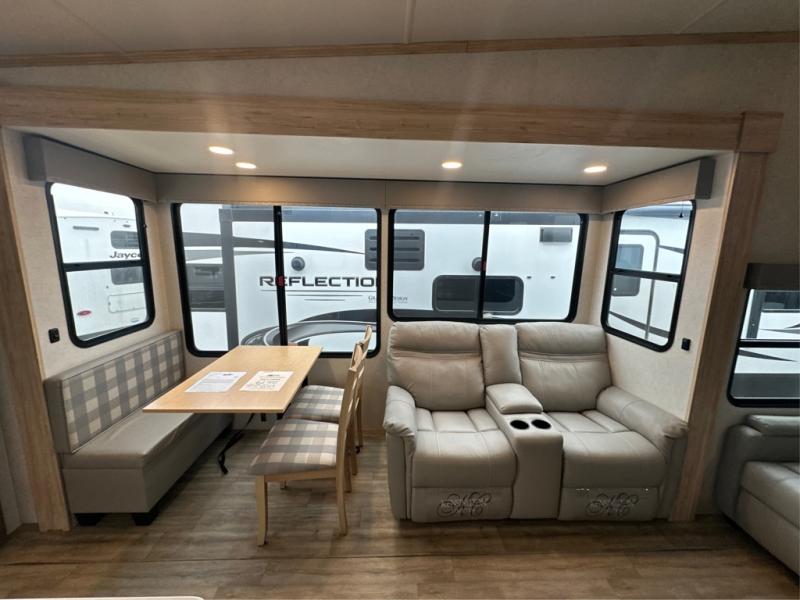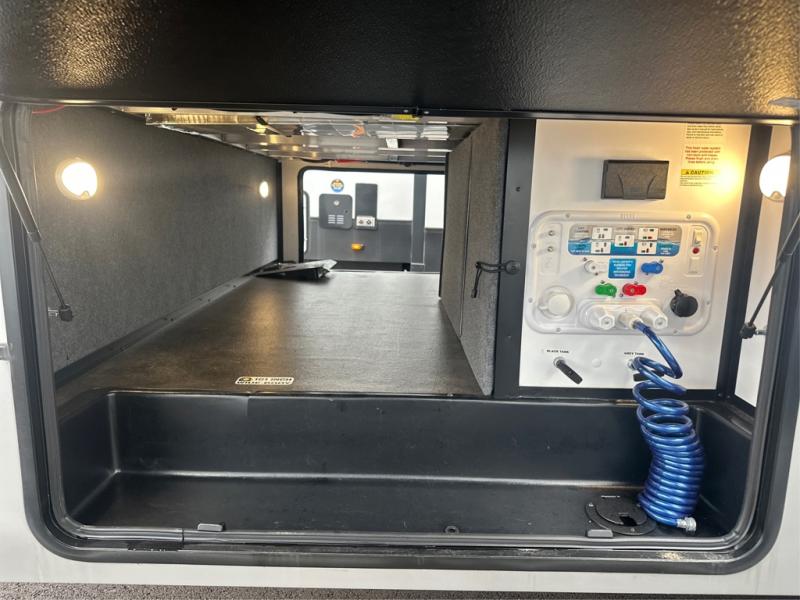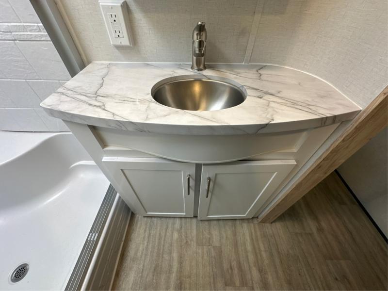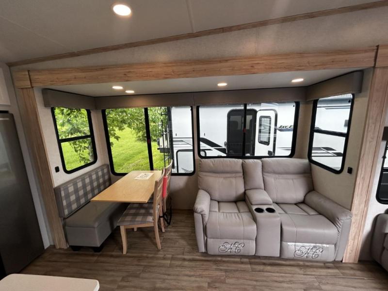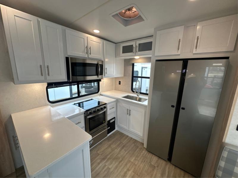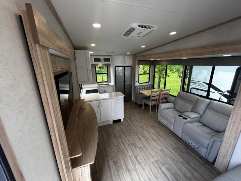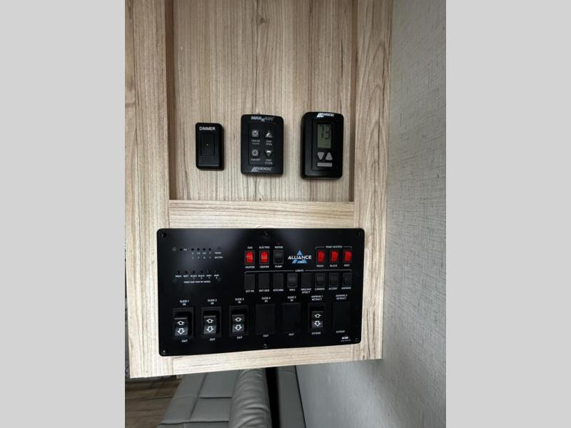 A benchmark chassis creates a space saver upper deck with each one of these Avenue fifth wheels by Alliance RV! The 101 in. wide-body construction gives you more room to walk around and the flush slide out floors throughout prevent any tripping. There are Azdel composite sidewalls inside and out, and a seamless fully walkable PVC roof for extreme durability, zero maintenance, and it is more solar reflective because of the bright white color. Twin 13,500 BTU A/C units provide 27,000 BTUs of cooling power which are ultra quiet and independently controlled keeping you comfortable during your entire trip. And, the fully enclosed and heated underbelly means that you can extend your camping season into the colder months if you like. You are sure to love the "no carpet zone" making each Avenue easy to clean and allergen free, not to mention pet friendly with vinyl flooring throughout. And, strategically placed Atrium windows in the bedroom and living area will not only provide more light, cross ventilation and fresh air, but bring a spectacular view of your surroundings right inside. You can maximize your space throughout with innovative storage solutions like the hidden storage behind the TV, inside the end tables, ottoman, and dinette chairs. Come choose your favorite model today!