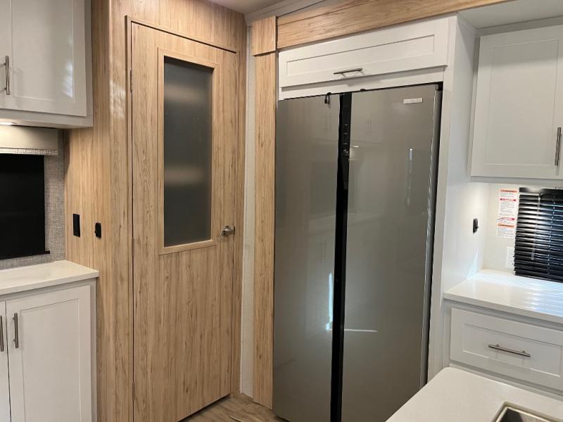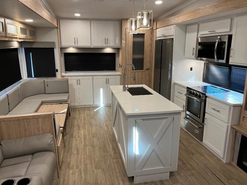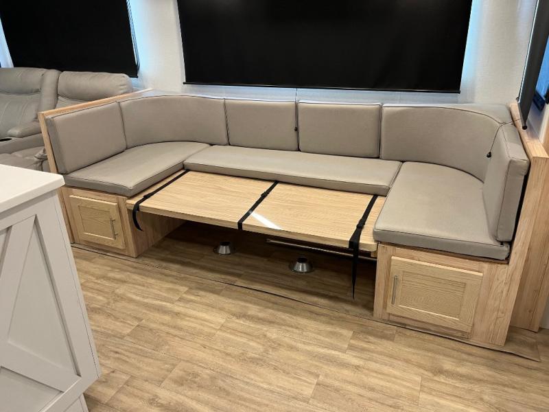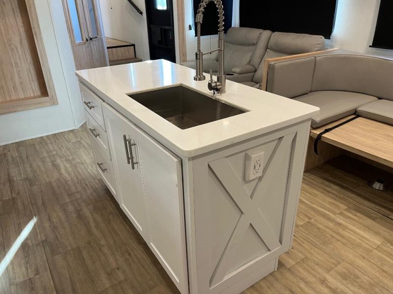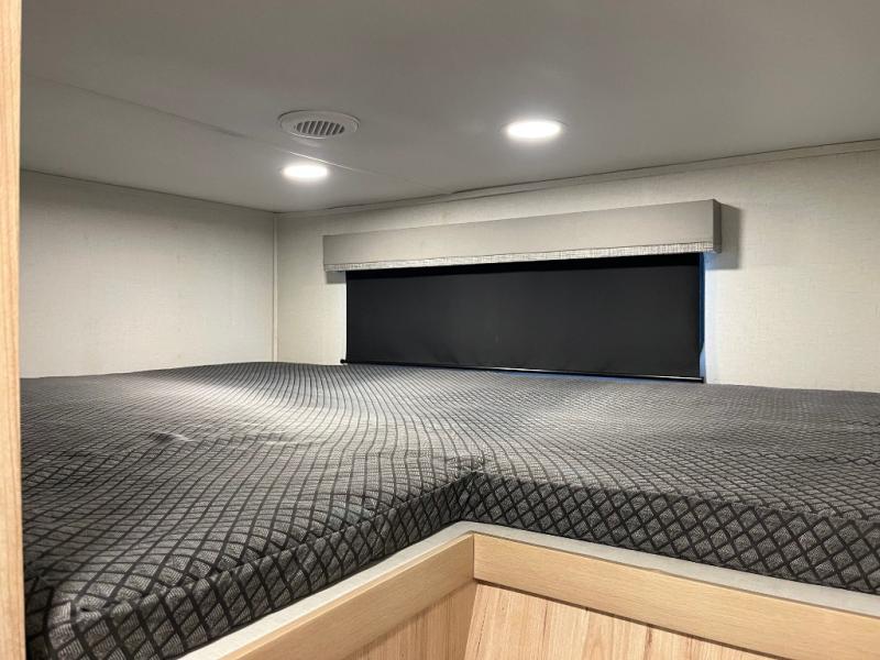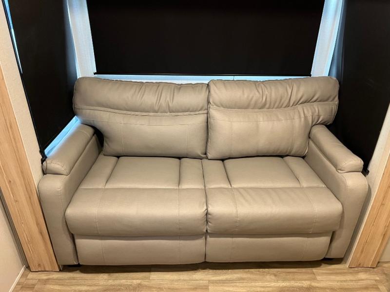 This fifth wheel is packed full with comfortable features! The front private bedroom has a queen bed slide that can be switched out for an optional king bed, a dresser, and a front wardrobe that is prepped to add an optional washer and dryer. Freshen up each morning in the full bathroom with a 30" x 50" shower then head to the full kitchen to prepare breakfast with the kitchen island and three burner cooktop. The second bedroom has a sofa slide with a loft above it all. Relax each night on the dual recliner theater seating across from the swing mount 50" HDTV with hidden storage behind it or play a few games at the U-shaped dinette. This model also has the option to switch out the U-shaped dinette for an optional floating dinette table beside the theater seat. You also have an outside refrigerator and outside griddle by a flip-up baggage door for storage!