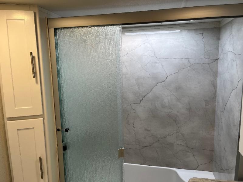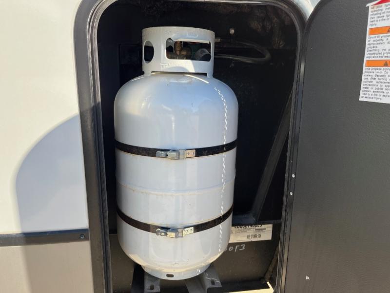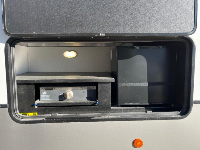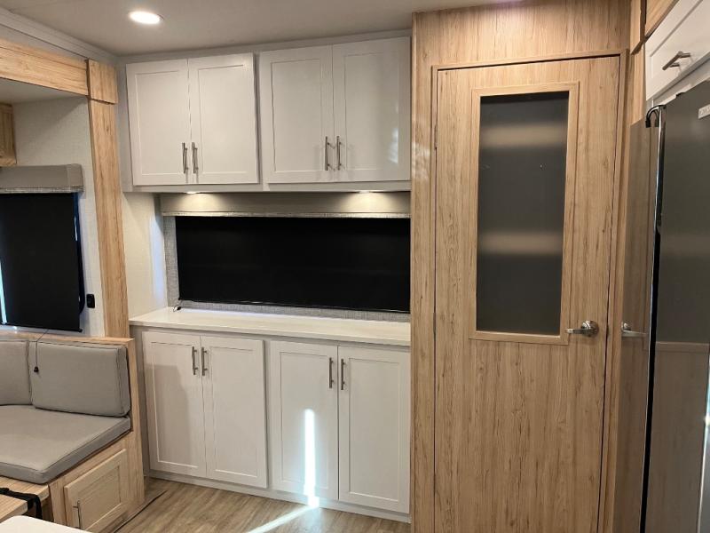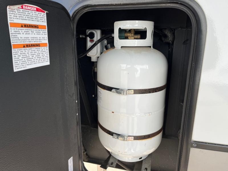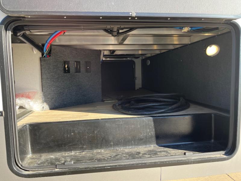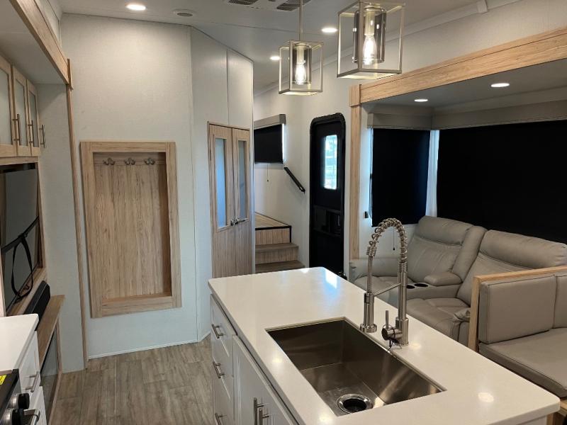 This fifth wheel is packed full with comfortable features! The front private bedroom has a queen bed slide that can be switched out for an optional king bed, a dresser, and a front wardrobe that is prepped to add an optional washer and dryer. Freshen up each morning in the full bathroom with a 30" x 50" shower then head to the full kitchen to prepare breakfast with the kitchen island and three burner cooktop. The second bedroom has a sofa slide with a loft above it all. Relax each night on the dual recliner theater seating across from the swing mount 50" HDTV with hidden storage behind it or play a few games at the U-shaped dinette. This model also has the option to switch out the U-shaped dinette for an optional floating dinette table beside the theater seat. You also have an outside refrigerator and outside griddle by a flip-up baggage door for storage!