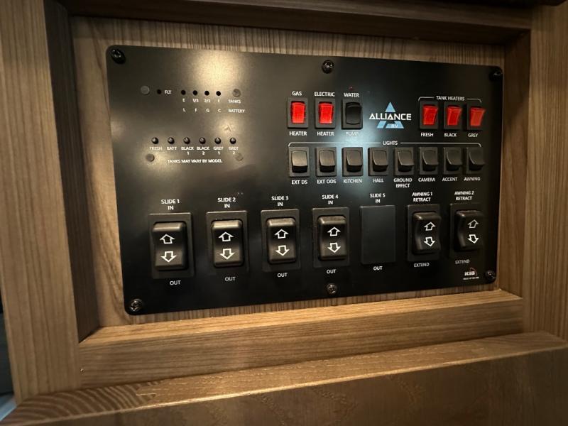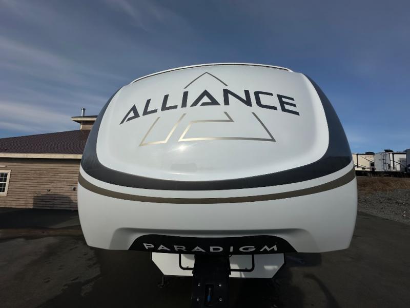 The Paradigm fifth wheels by Alliance RV are functional, high-quality, and luxurious for an unforgettable camping experience. There are three A/C units and a 40K BTU furnace to keep you comfortable year around, and you'll appreciate additional convenient amenities, like the all-in-one enclosed/heated utility center and the color coded and numbered wiring. A Roto-Flex pin box comes standard for hassle-free towing, along with Super-G 4,400 lb. rated tires and Dexter 7,000 lb. axles. You'll love the kitchen with its LG solid surface countertops and Insignia range, plus there is LED motion lighting in the pantry and a Maxx fan with a rain sensor to keep everything fresh when making dinner. Each model also includes an HD Smart TV in the living room and bedroom, plus a Winegard Air 360 antenna to keep you connected to the outside world. And of course there are a variety of options you can choose from to further customize your fifth wheel; dual pane windows, Super Solar Plus, slide out awning toppers, and generator prep or a generator to name a few!