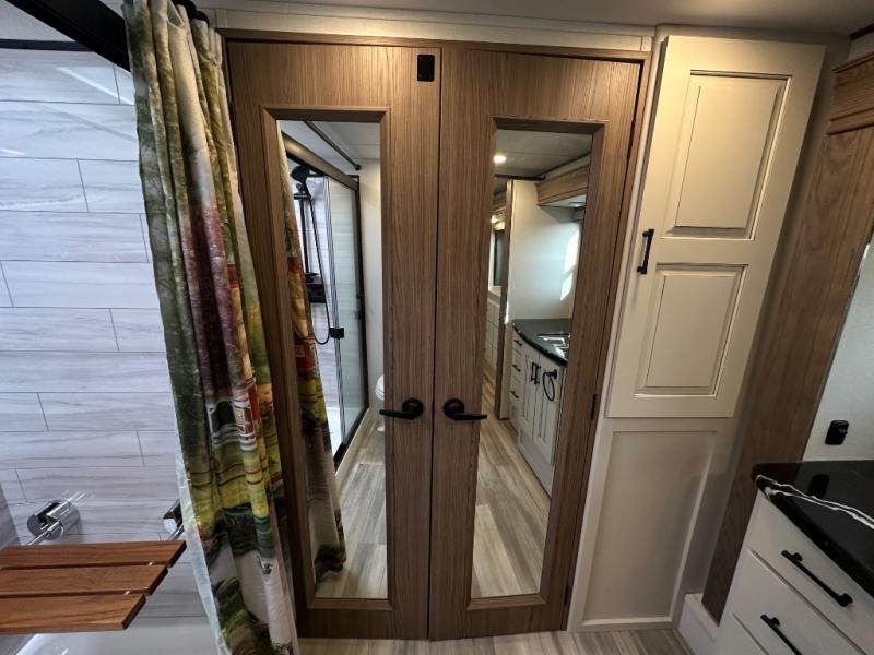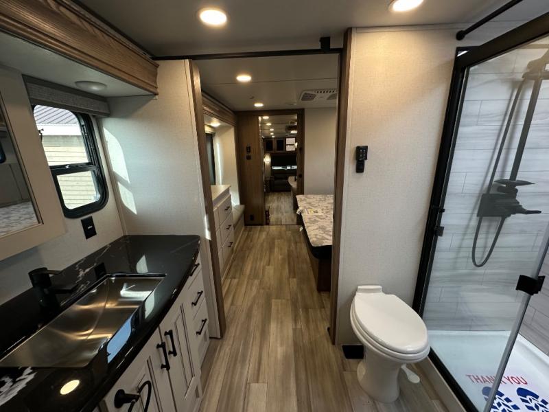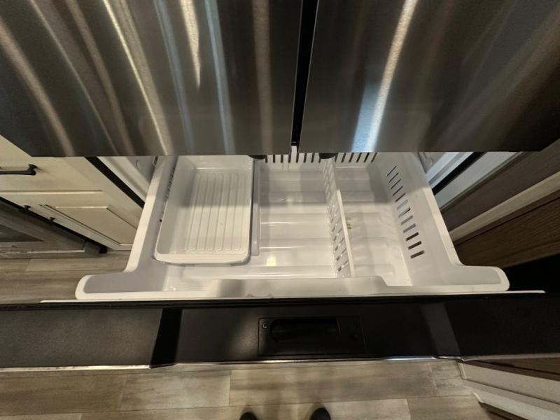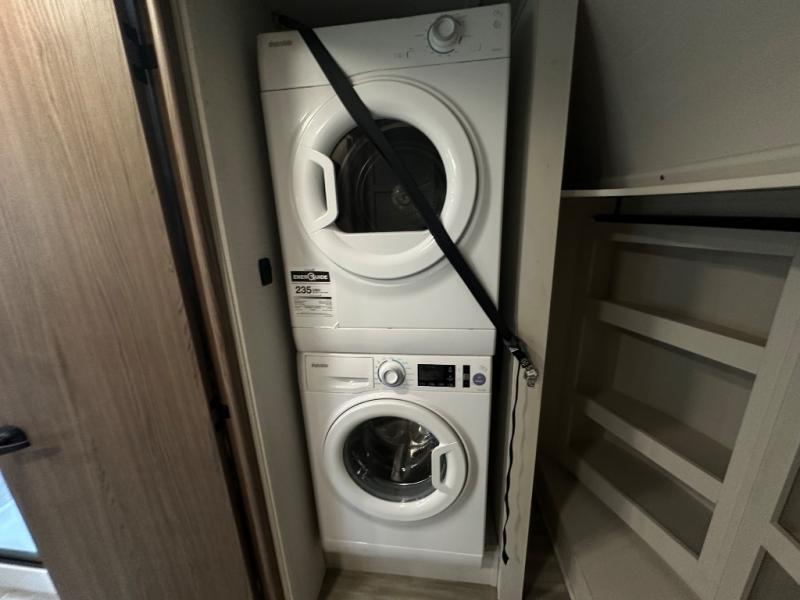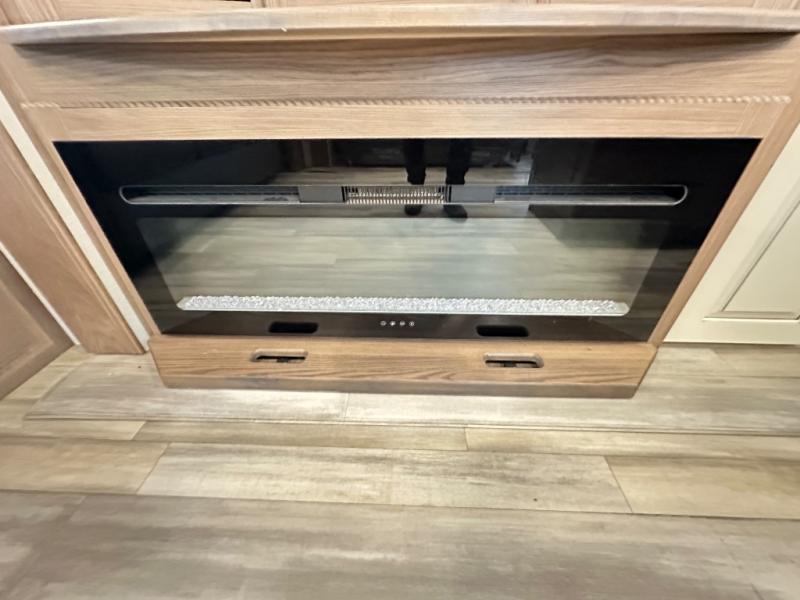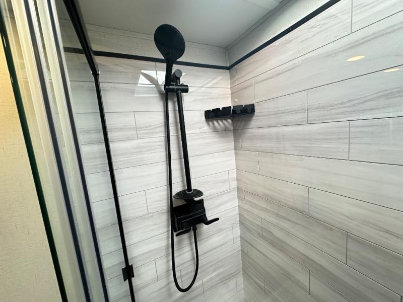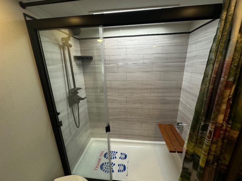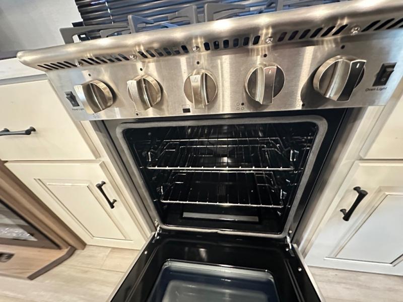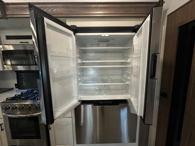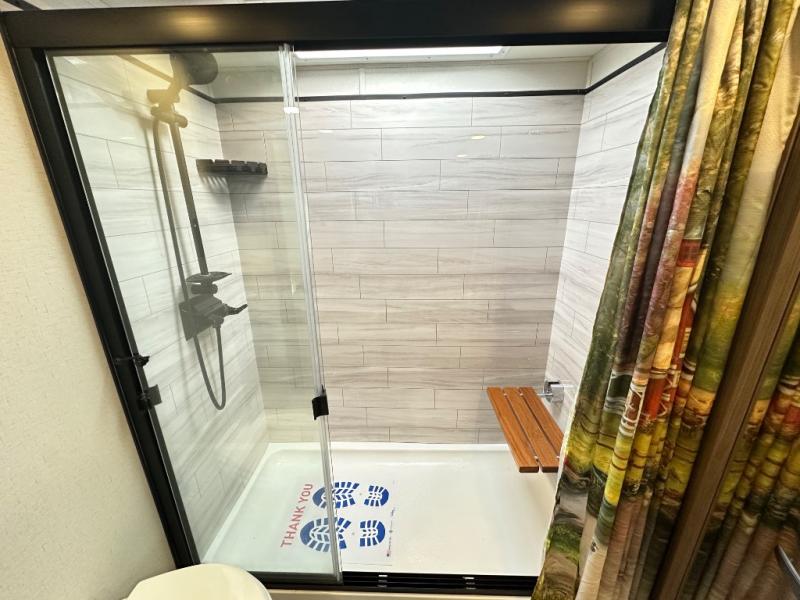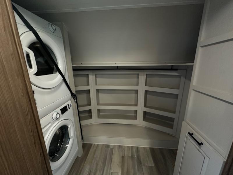 Whether you decide to be a full-timer or a long-trip traveler, this Paradigm offers so many comforts and conveniences you will love! The large full bathroom might be the reason you decide to be a new owner because you will have a large 61" x 30" shower to get cleaned up in, linen storage, and a walk-in closet with a hamper, shelves, and a space prepped for an optional washer/dryer. The bedroom allows you to sleep like a king and gives you extra floor space with the two slides, and there is storage in the flip-top dresser and under the seat, plus you can watch the Smart TV. The space saving sliding doors offer style as well. The cook will love all the residential appliances, you can even choose the residential refrigerator option. The kitchen island gives you a stainless steel farm sink and a place to add a dishwasher option. The half bath is super convenient just like the entry sitting bench/coat rack and closet. And you can relax on the sleeper sofa or the dual recliner love seat. There is so much more to see!