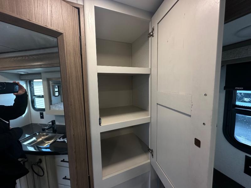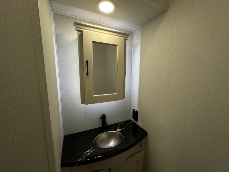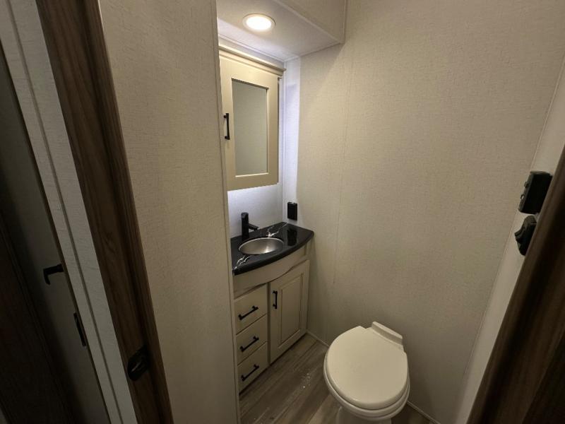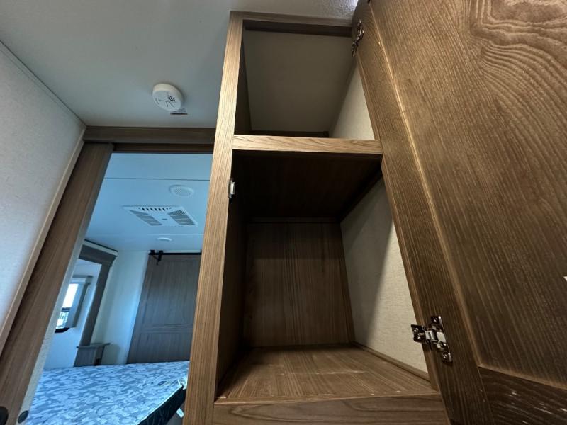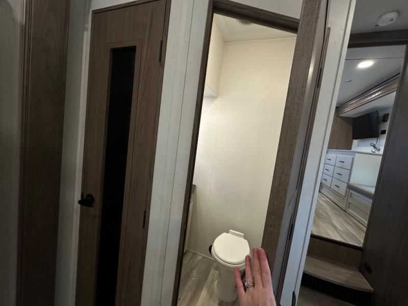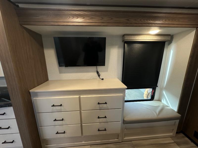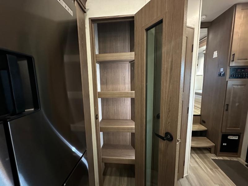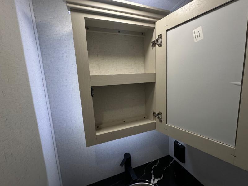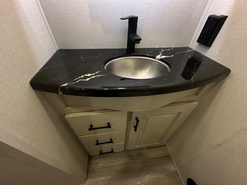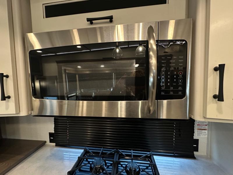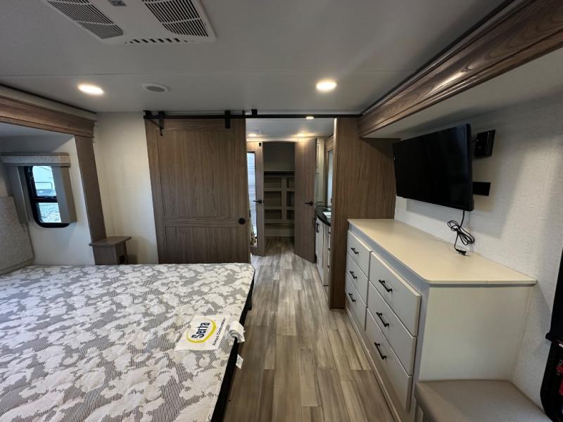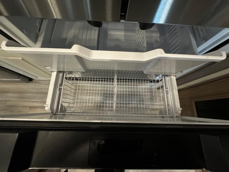 Whether you decide to be a full-timer or a long-trip traveler, this Paradigm offers so many comforts and conveniences you will love! The large full bathroom might be the reason you decide to be a new owner because you will have a large 61" x 30" shower to get cleaned up in, linen storage, and a walk-in closet with a hamper, shelves, and a space prepped for an optional washer/dryer. The bedroom allows you to sleep like a king and gives you extra floor space with the two slides, and there is storage in the flip-top dresser and under the seat, plus you can watch the Smart TV. The space saving sliding doors offer style as well. The cook will love all the residential appliances, you can even choose the residential refrigerator option. The kitchen island gives you a stainless steel farm sink and a place to add a dishwasher option. The half bath is super convenient just like the entry sitting bench/coat rack and closet. And you can relax on the sleeper sofa or the dual recliner love seat. There is so much more to see!